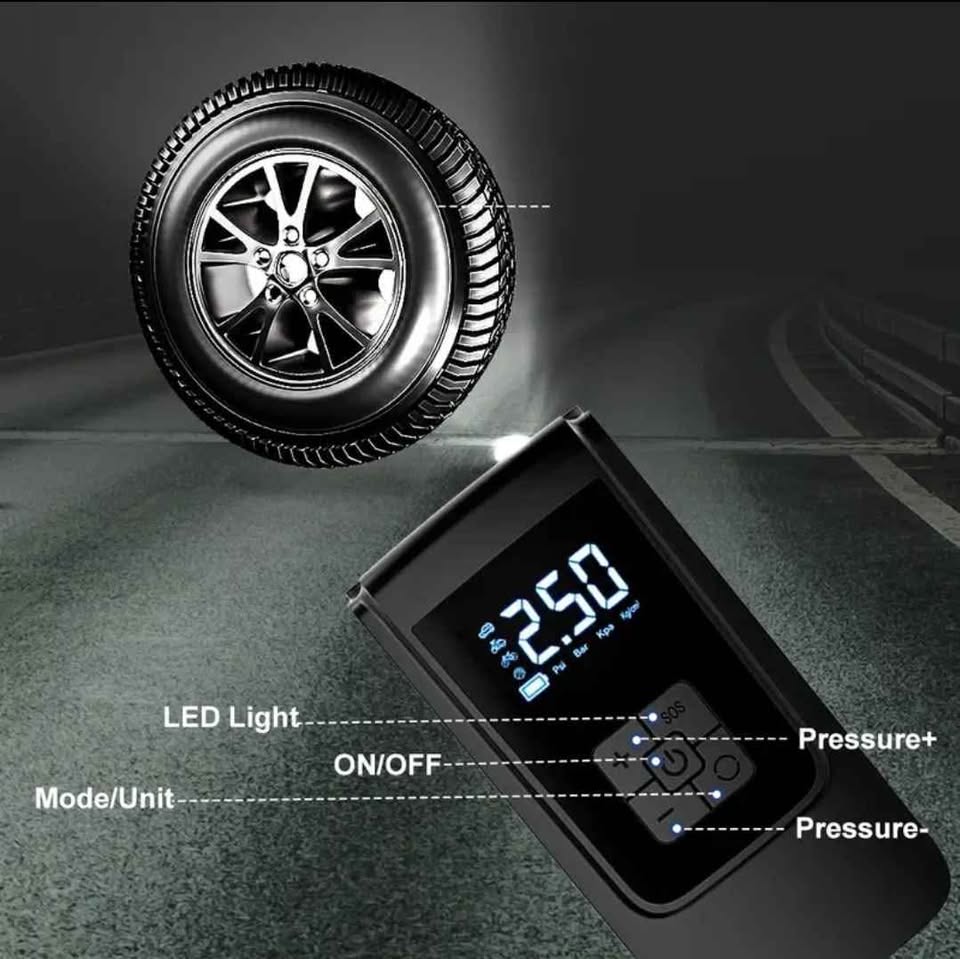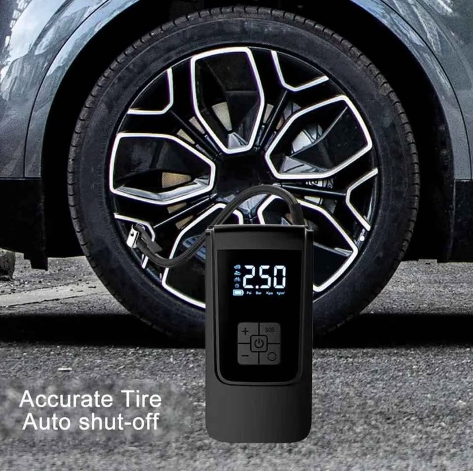 Brand new rechargeable wireless tire inflator with digital pressure gauge, auto-shut off safety feature, and emergency LED light.
