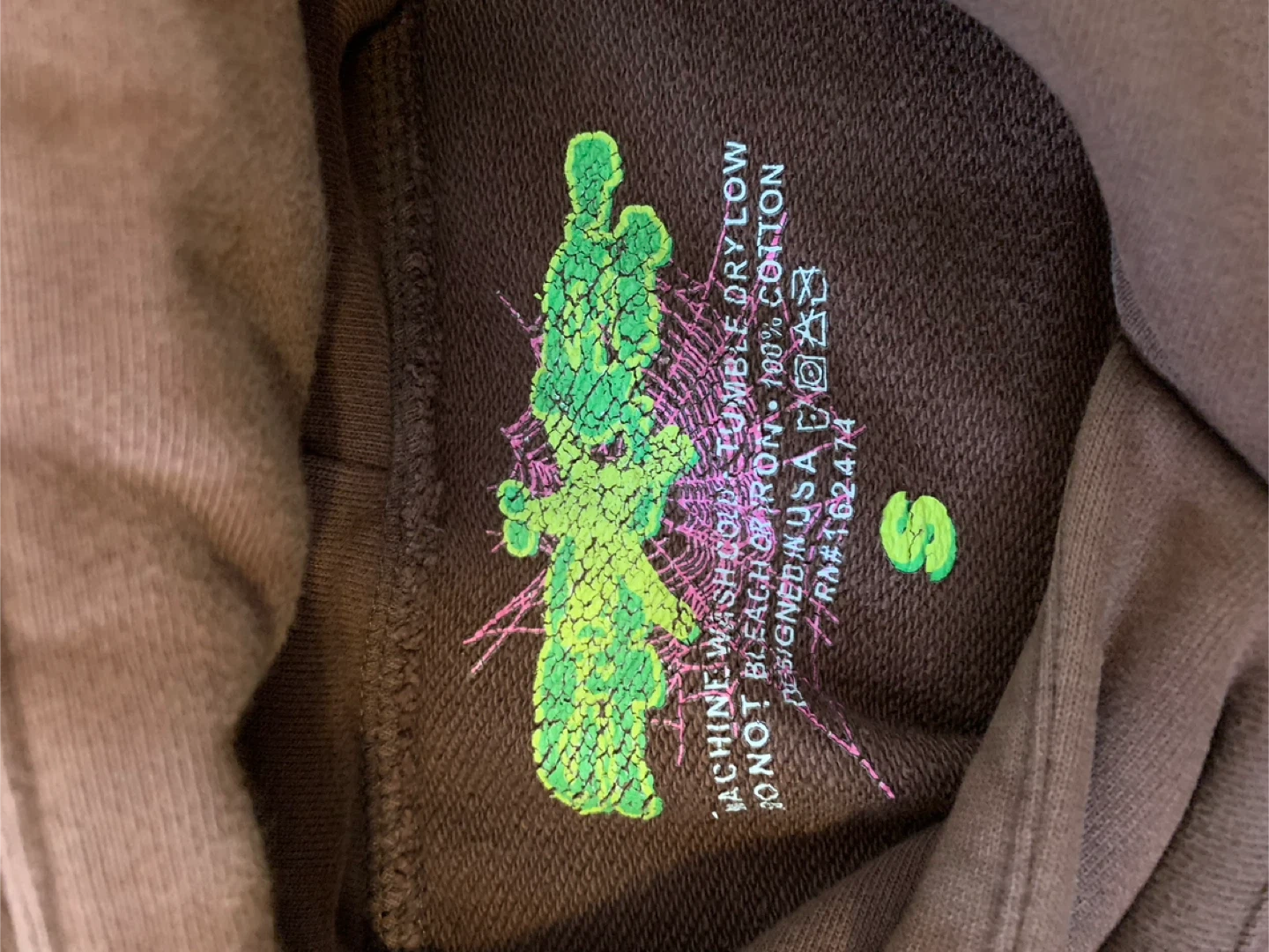 Brown Spider hoodie with pink and red graphic. It's 100% cotton. Designed in USA. Size S.