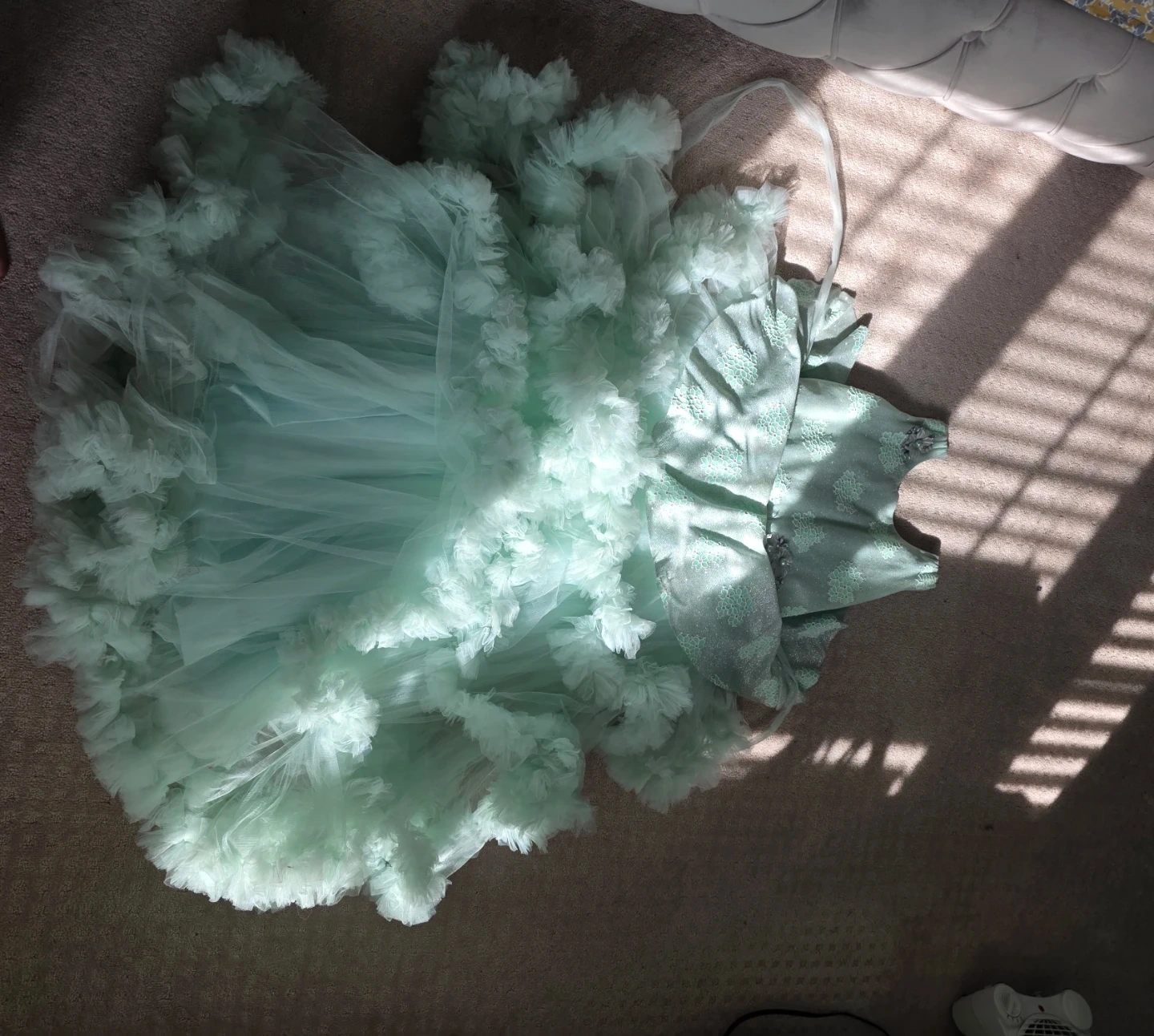 This is a beautiful mint green tulle dress. It features a sleeveless design with intricate detailing on the bodice. Perfect for special occasions or photoshoots!