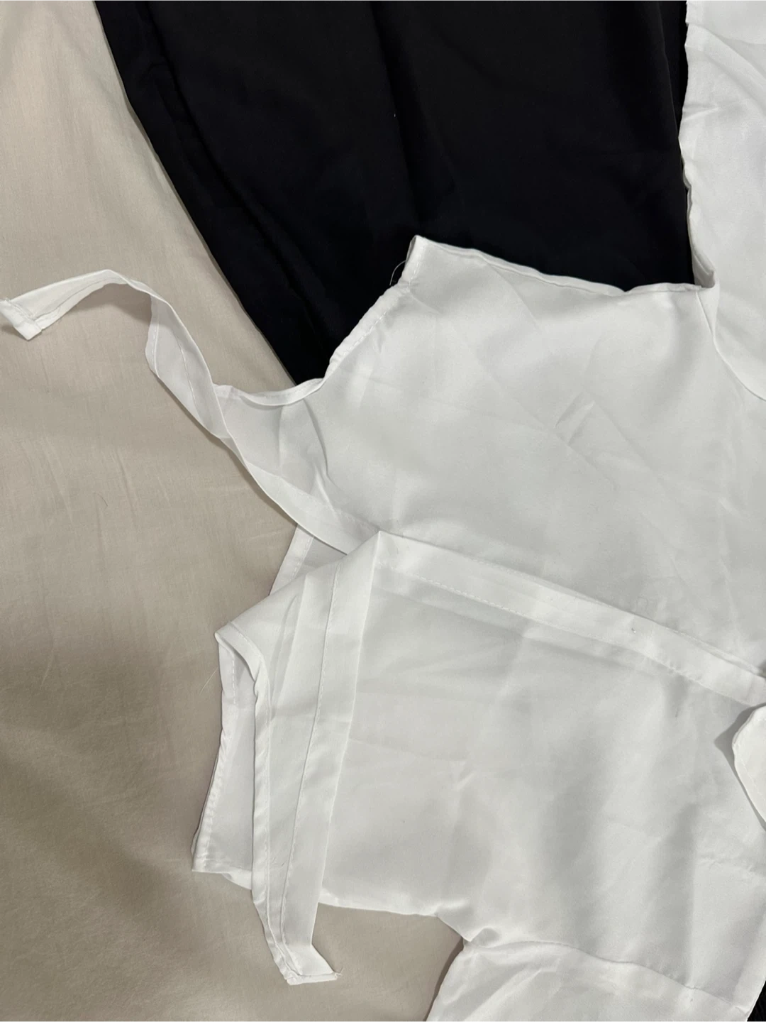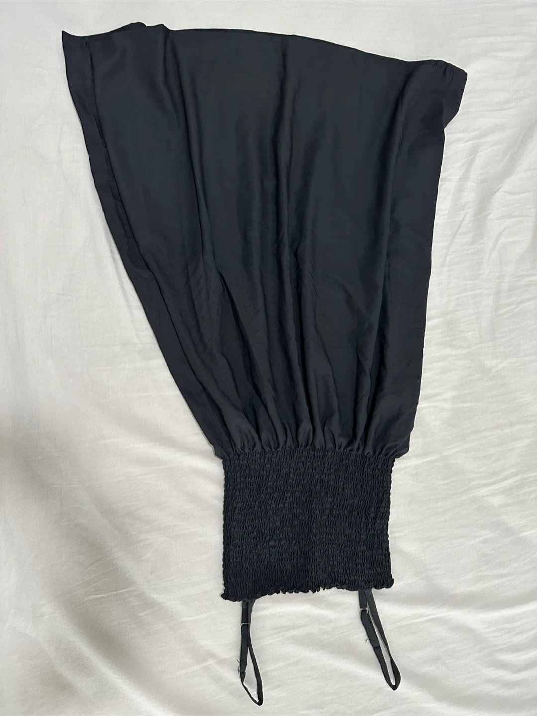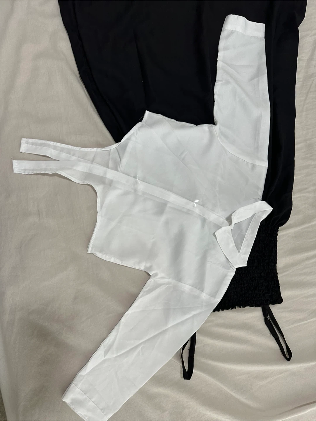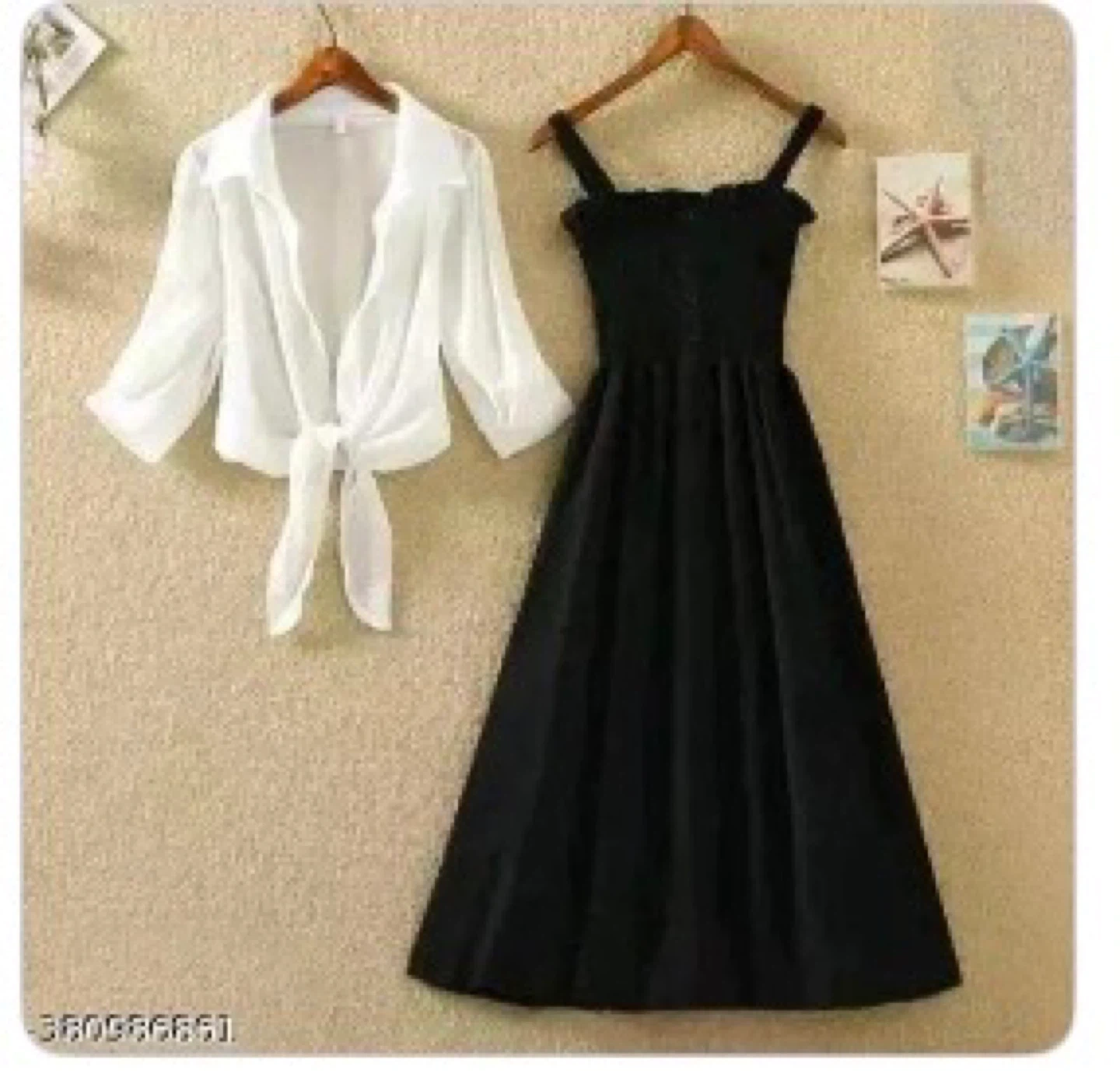Two-piece set featuring a black smocked sundress and a white long-sleeved tie-front blouse. The dress has adjustable spaghetti straps and a flowy skirt. Blouse is sheer and lightweight.