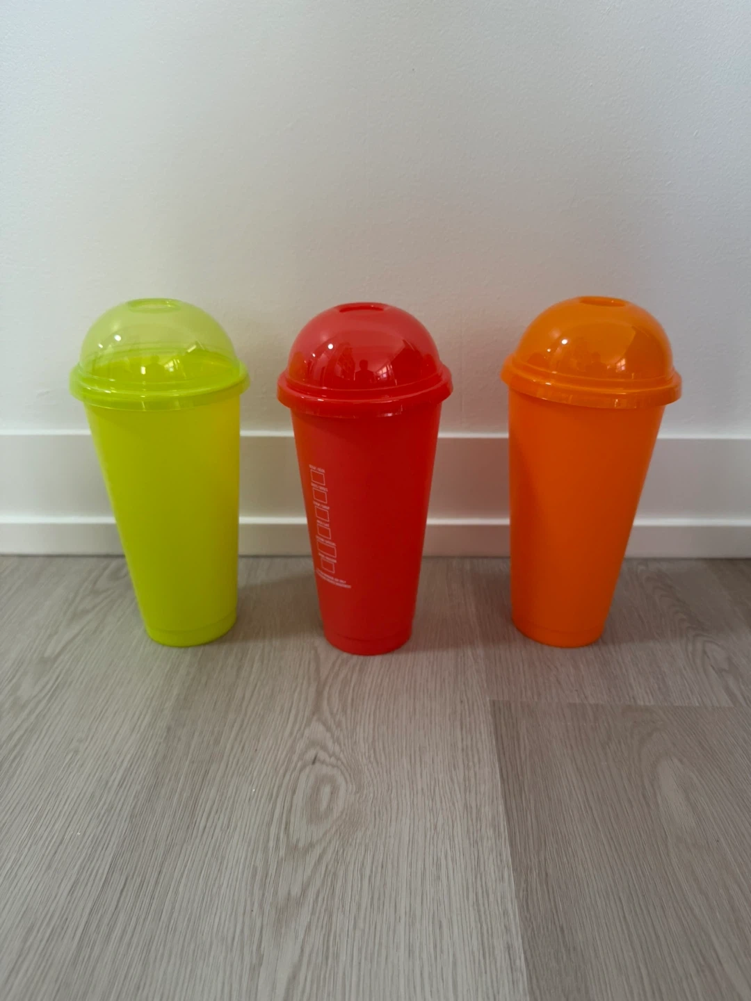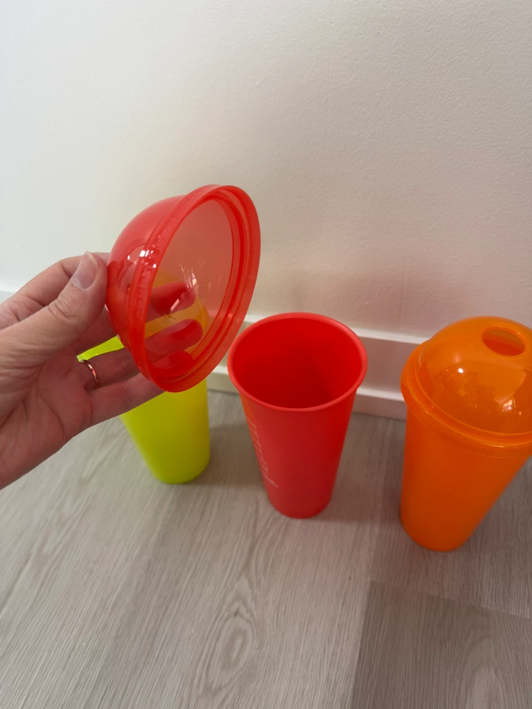 Three brand new and never used extra tall cups with lids. No straws with them, but take the standard Starbucks straws that come with most of their cups. Came out of a big pack and just don’t need so many cups. Smoke free home.