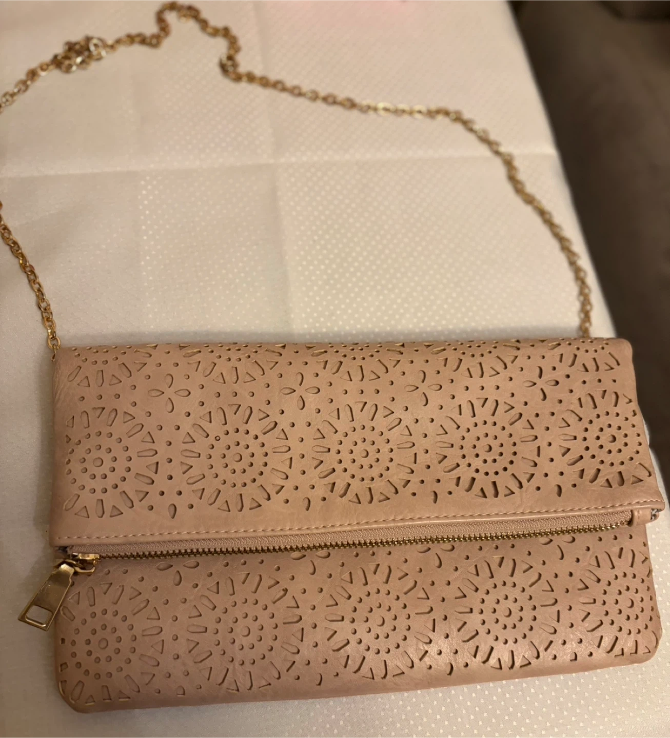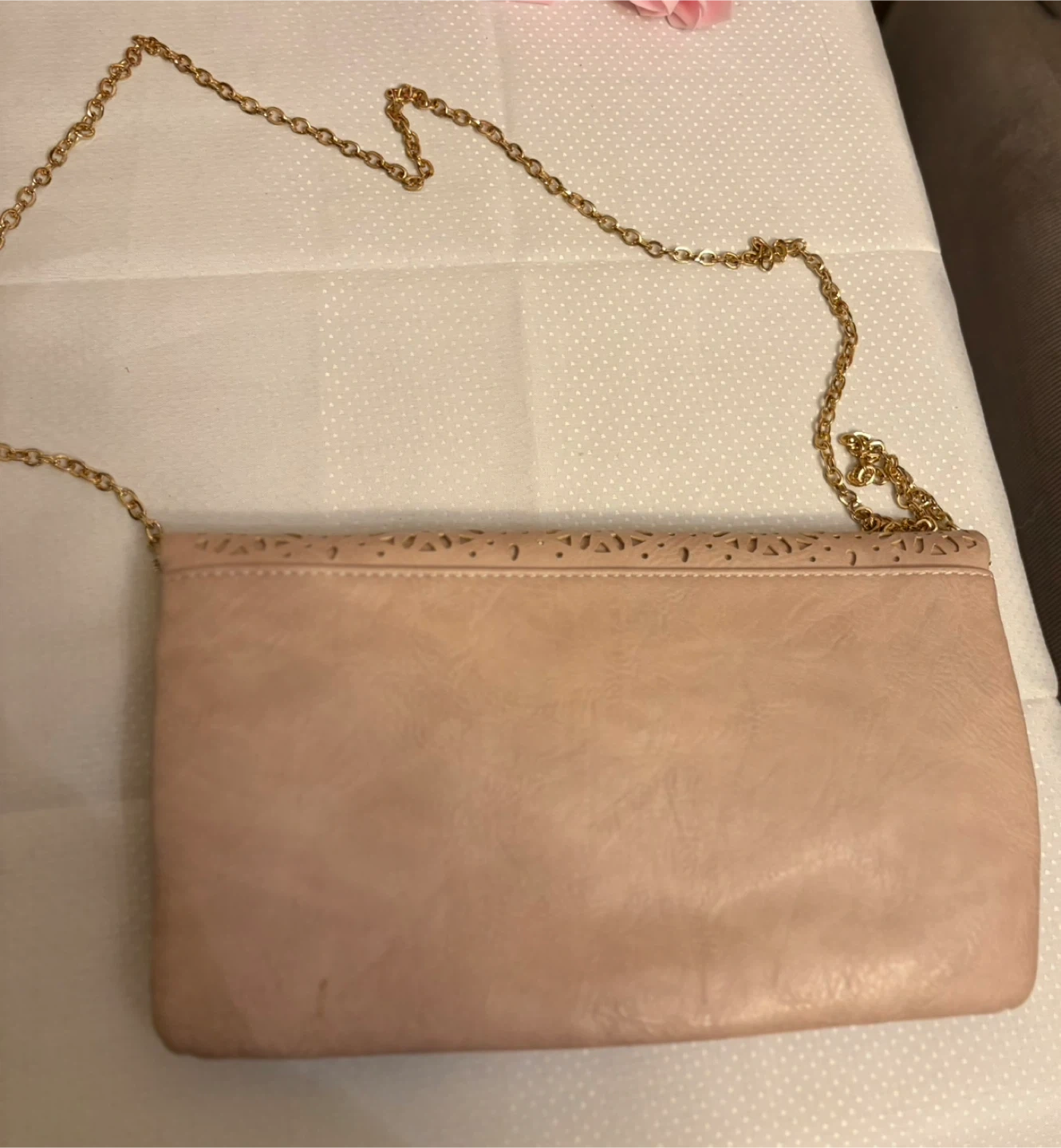 This blush pink foldover clutch features a faux leather material with intricate laser-cut detailing on the front flap. It includes a detachable gold-tone chain strap for versatile wear. The interior has a zip pocket and a magnetic snap closure. Removable chain . Plenty of space , very nice color in great condition very clean inside . It was a gray flower lining