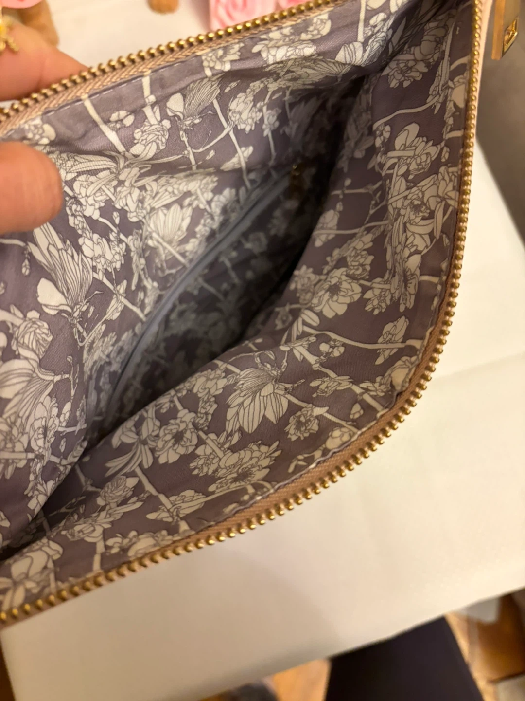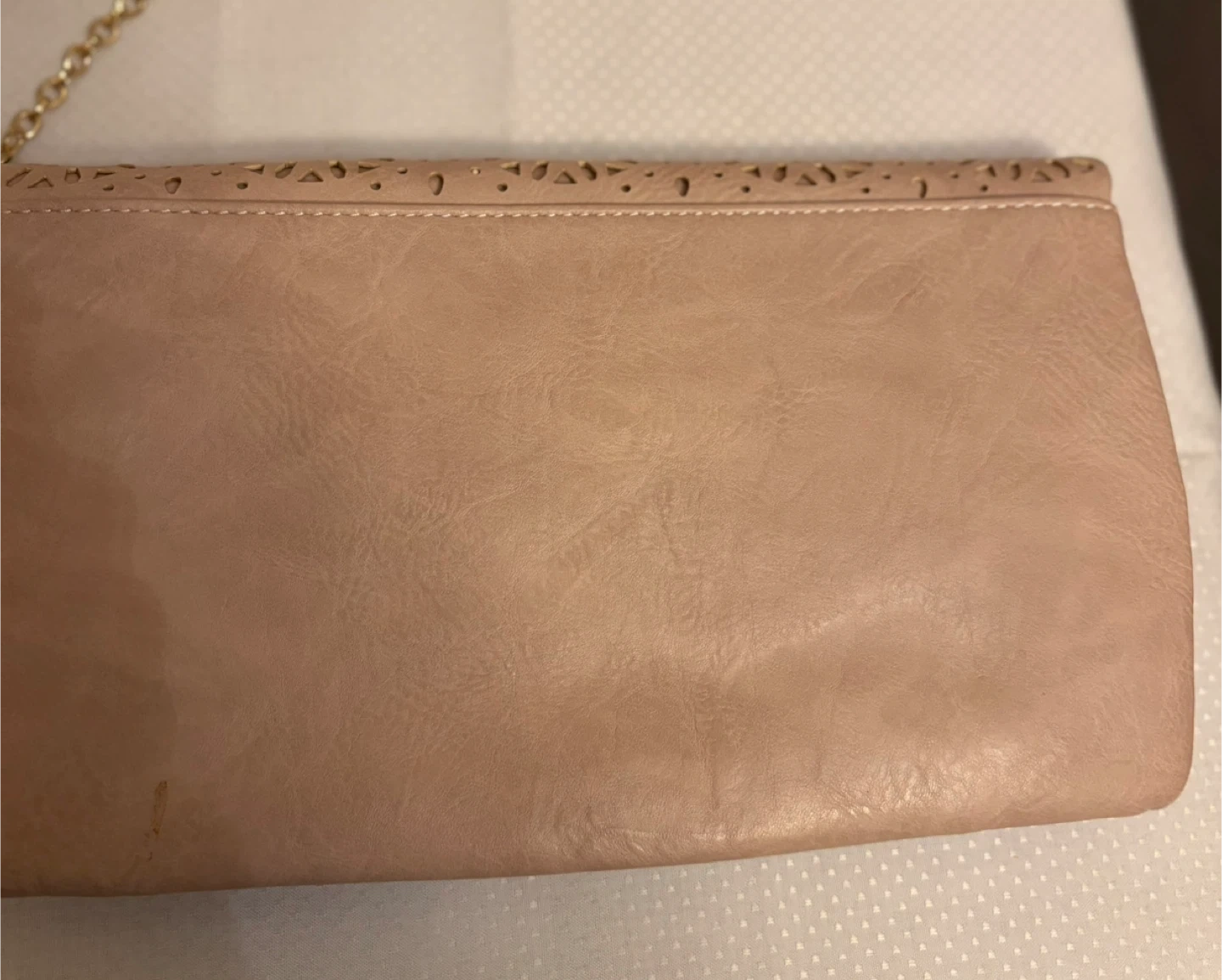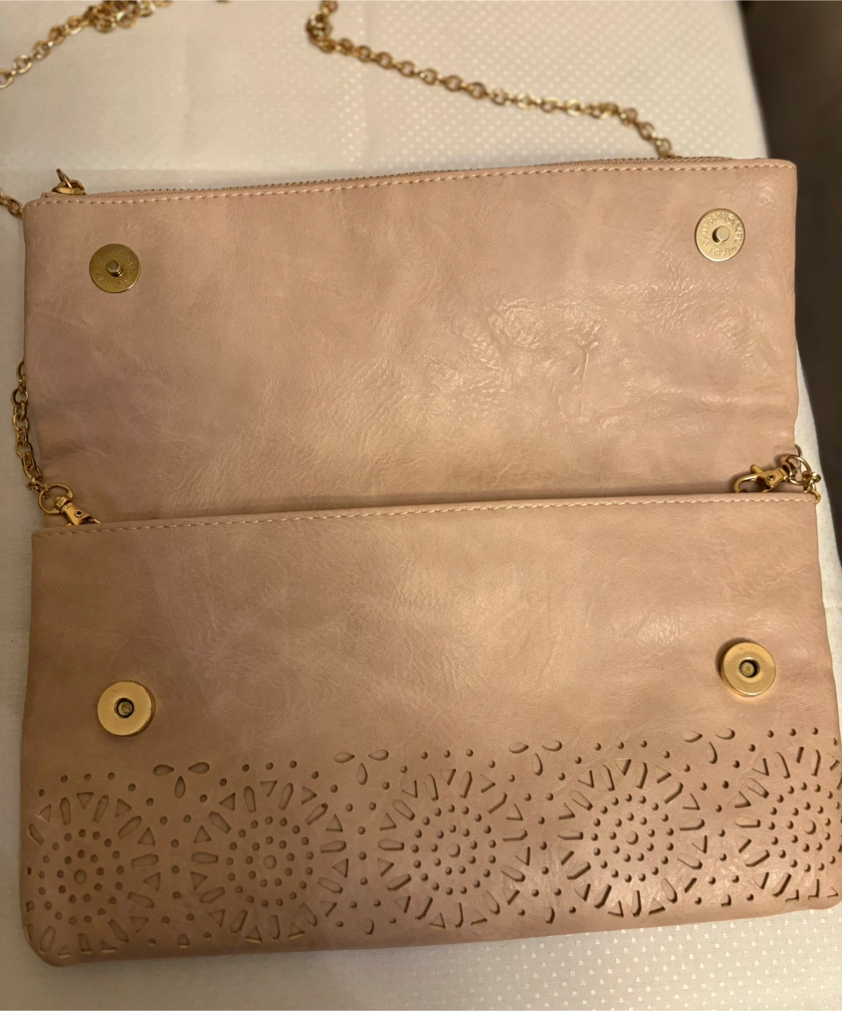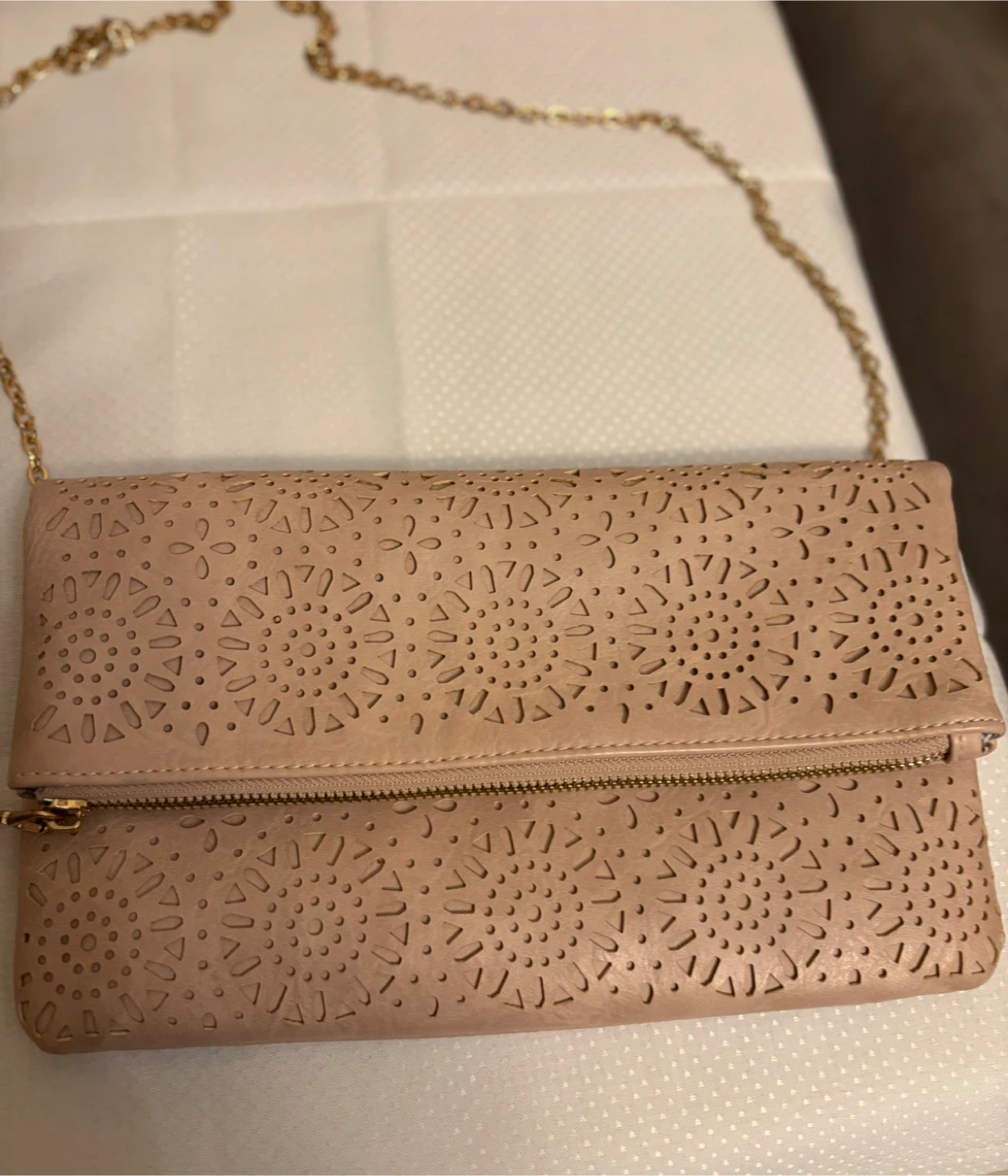 This blush pink foldover clutch features a faux leather material with intricate laser-cut detailing on the front flap. It includes a detachable gold-tone chain strap for versatile wear. The interior has a zip pocket and a magnetic snap closure. Removable chain . Plenty of space , very nice color in great condition very clean inside . It was a gray flower lining