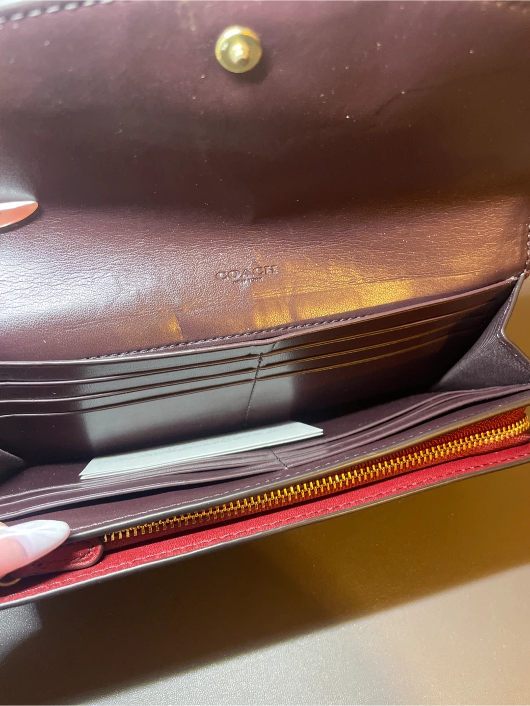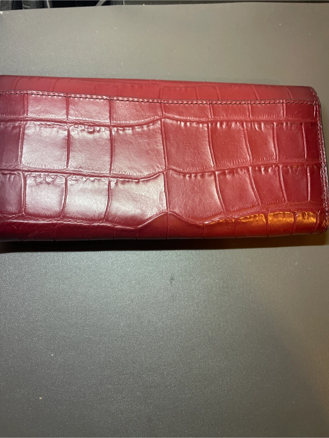 Gently used stylish Coach wallet in a deep red with a croc-embossed finish. It's made of genuine leather and features a snap closure with multiple card slots and a zippered coin pocket inside. Great for keeping your essentials organized!
