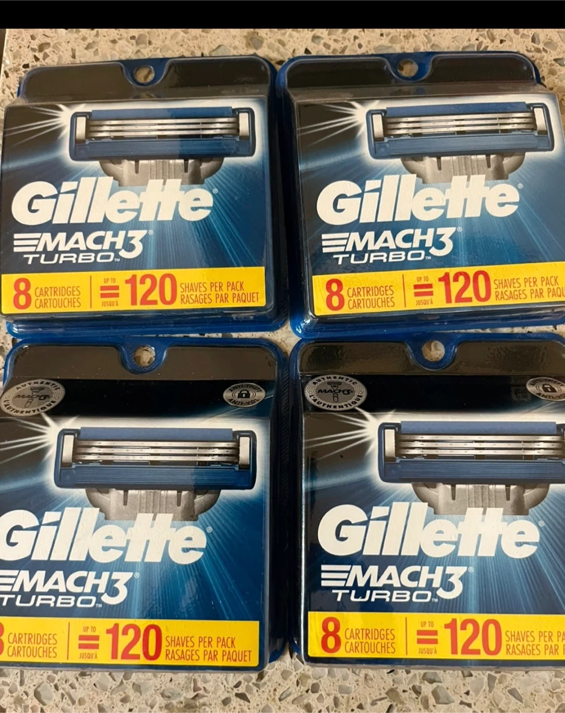 This listing includes four packs of Gillette Mach3 Turbo razor cartridges. Each pack contains 8 cartridges, offering up to 120 shaves per pack. These are designed for a smooth shave. Each pack is $30 dollars.