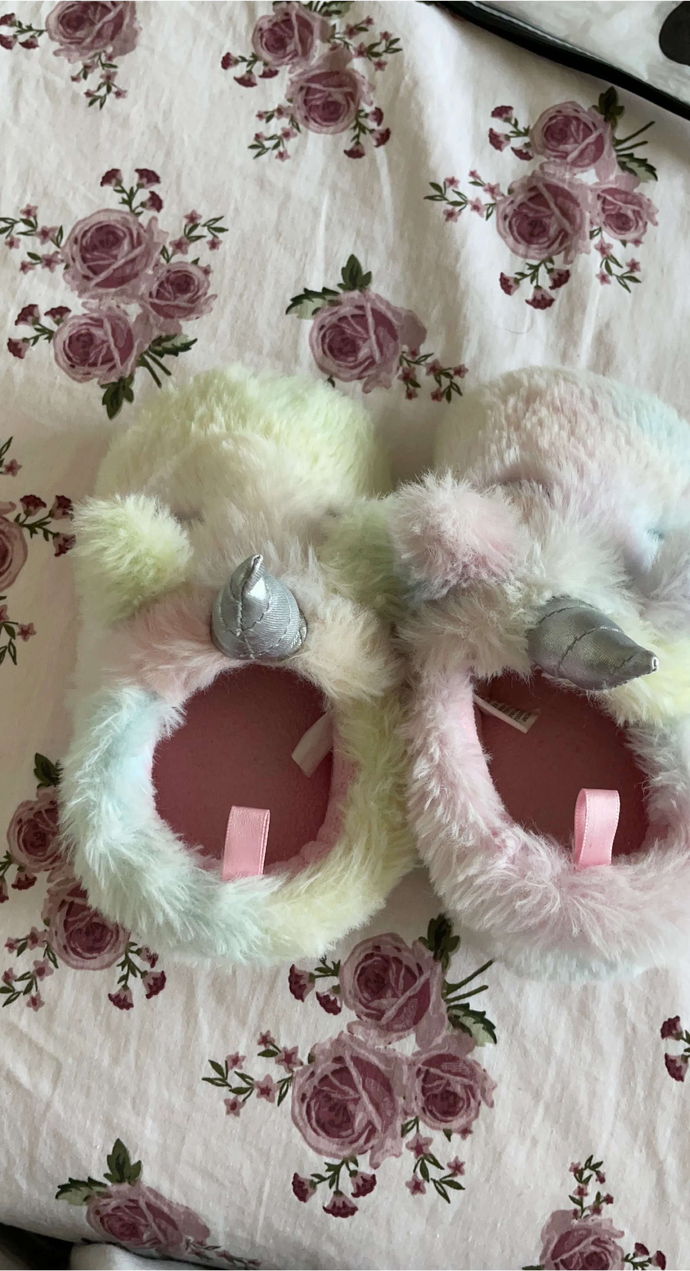 These unicorn plush slippers are super cute and cozy! They feature a soft, fluffy material with a silver horn and pink inner lining. Perfect for keeping little feet warm on chilly days