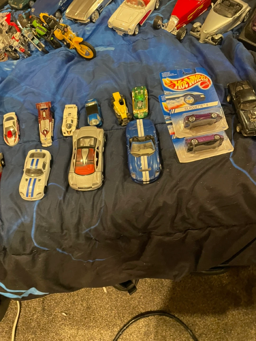 A collection of various die-cast model cars and a transformer figure. Includes Hot Wheels and other replicas. Most are loose, some are still in packaging.