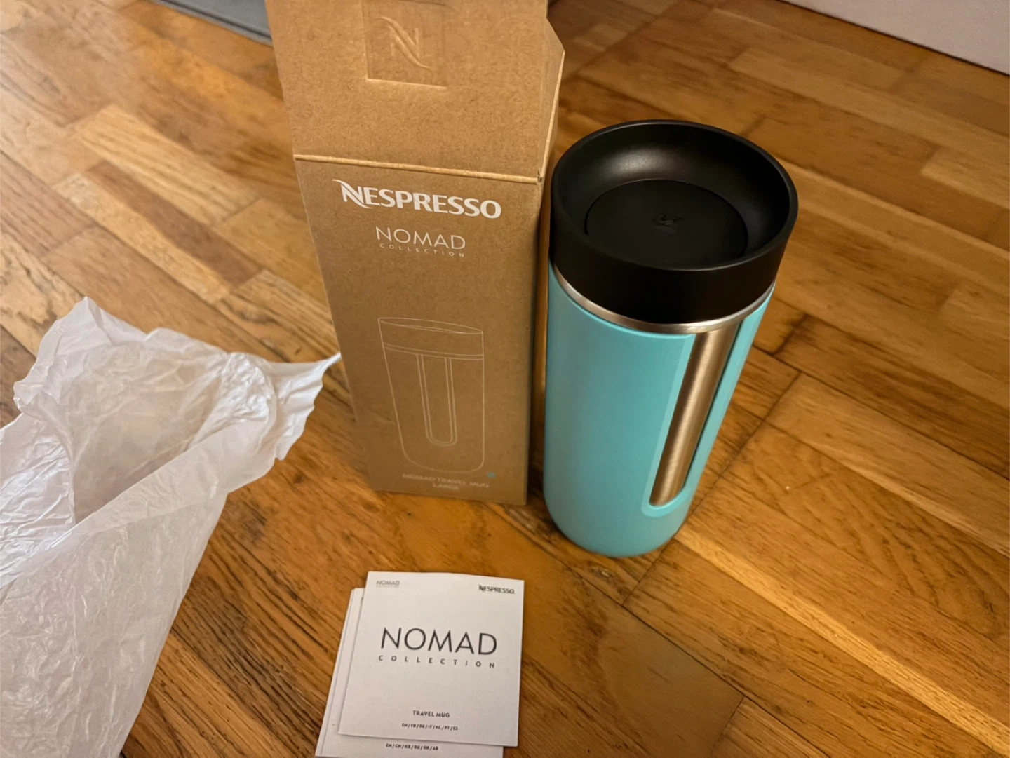 Nespresso Nomad Collection travel mug in teal. It's a large size with a stainless steel accent. Includes original box and documentation.