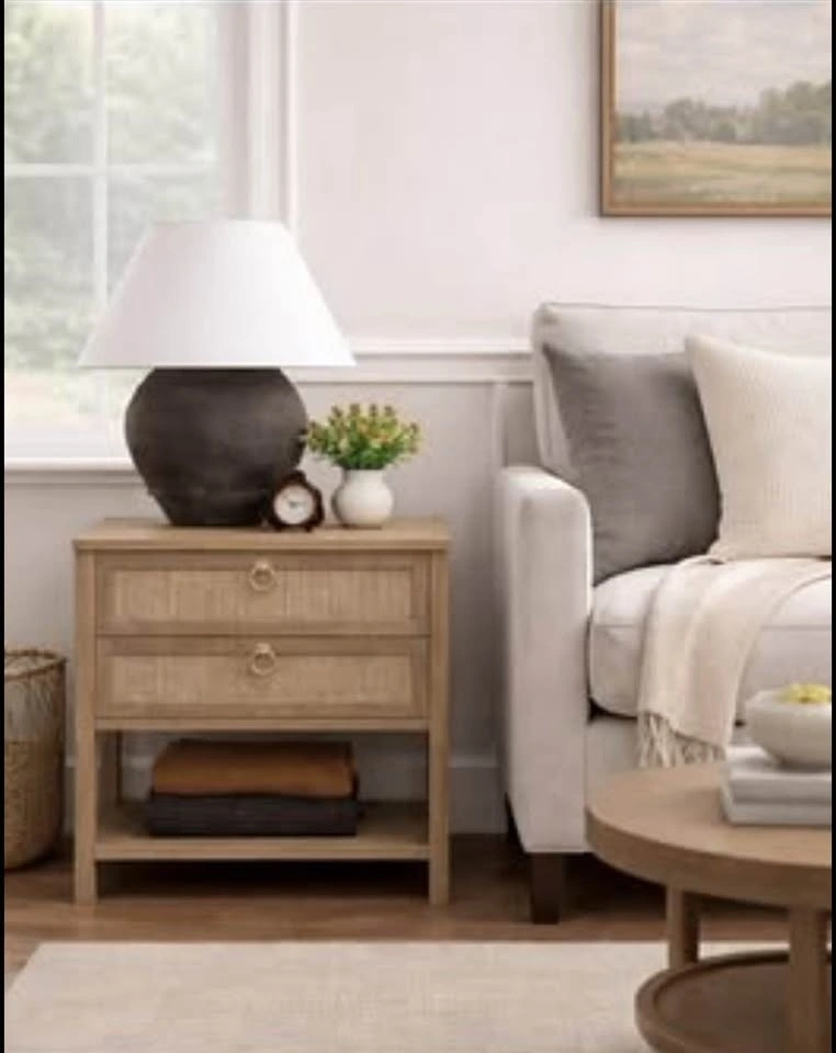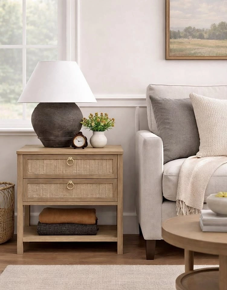 Warm wood tables featuring two drawers with woven rattan fronts. Perfect as nightstands, side tables, end tables, or as stylish extra storage in a bedroom, living room, or home office.