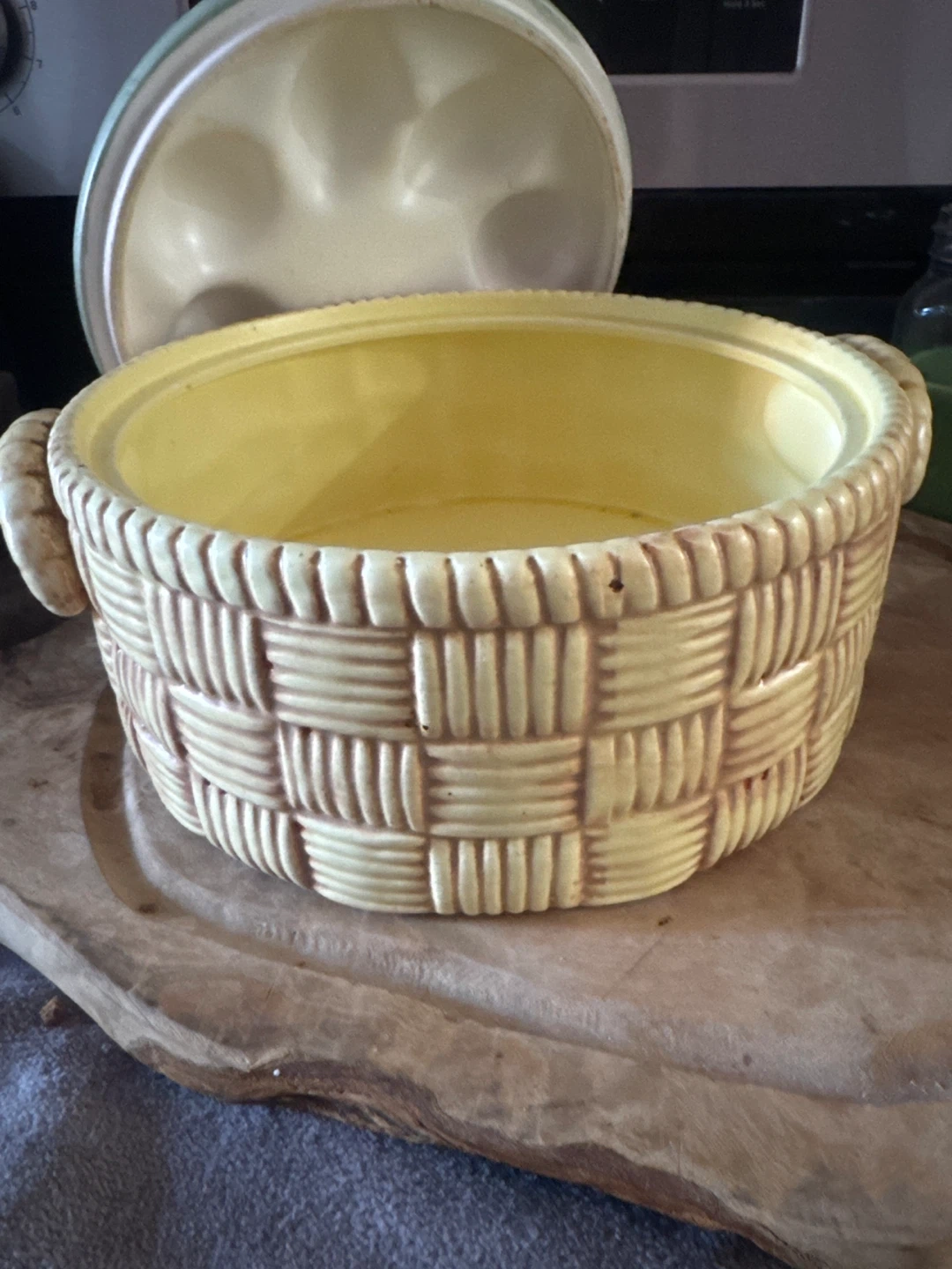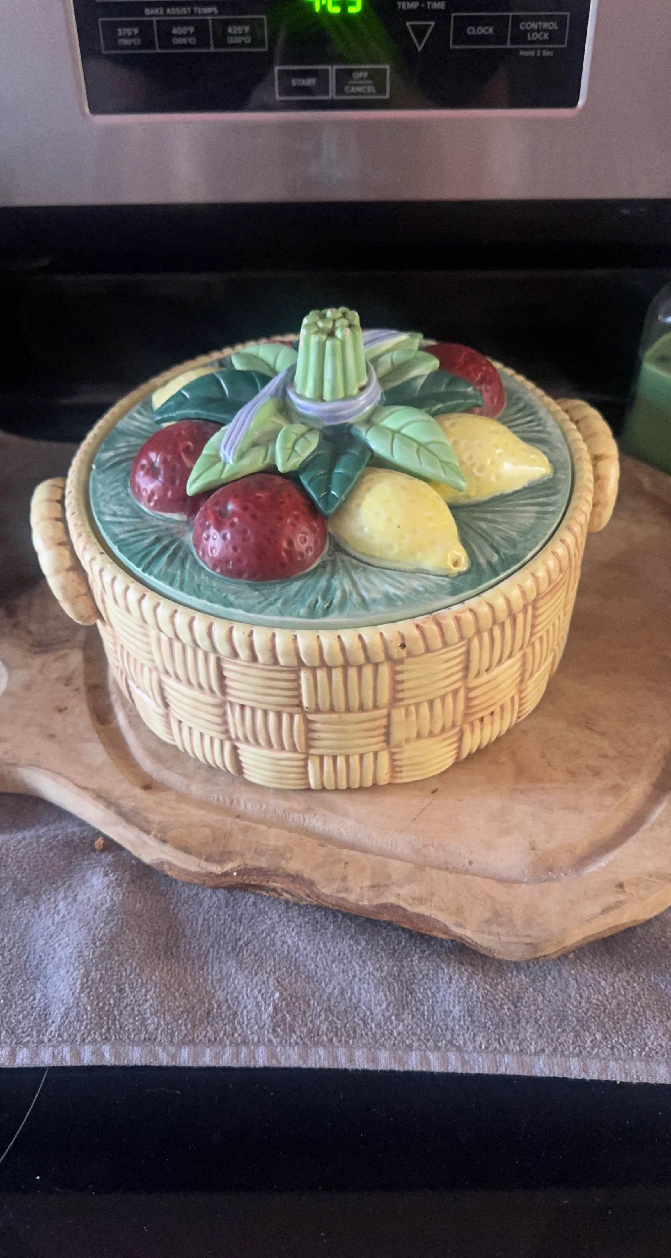 This vintage ceramic dish features a charming fruit basket design with raised strawberries and lemons on the lid. It's perfect for serving or display. The interior is a bright yellow.