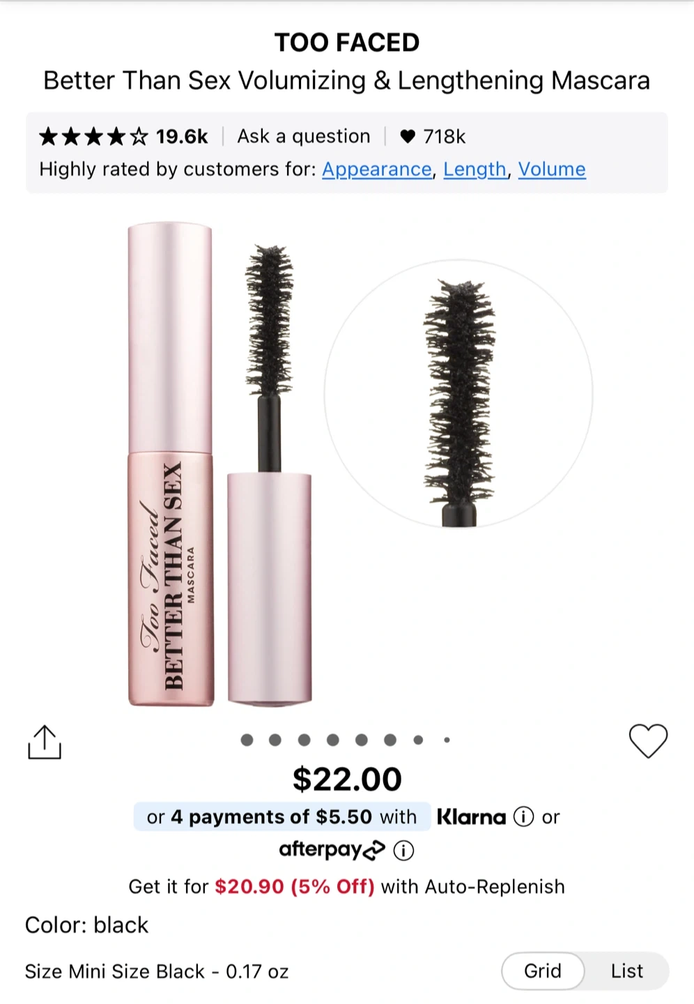 Too Faced Better Than Sex Mascara in mini size. Film-forming polymer locks curl in place. Acacia Senegal Tree extract for volume. Peptides condition lashes. Creates dramatic volume and longer lashes.