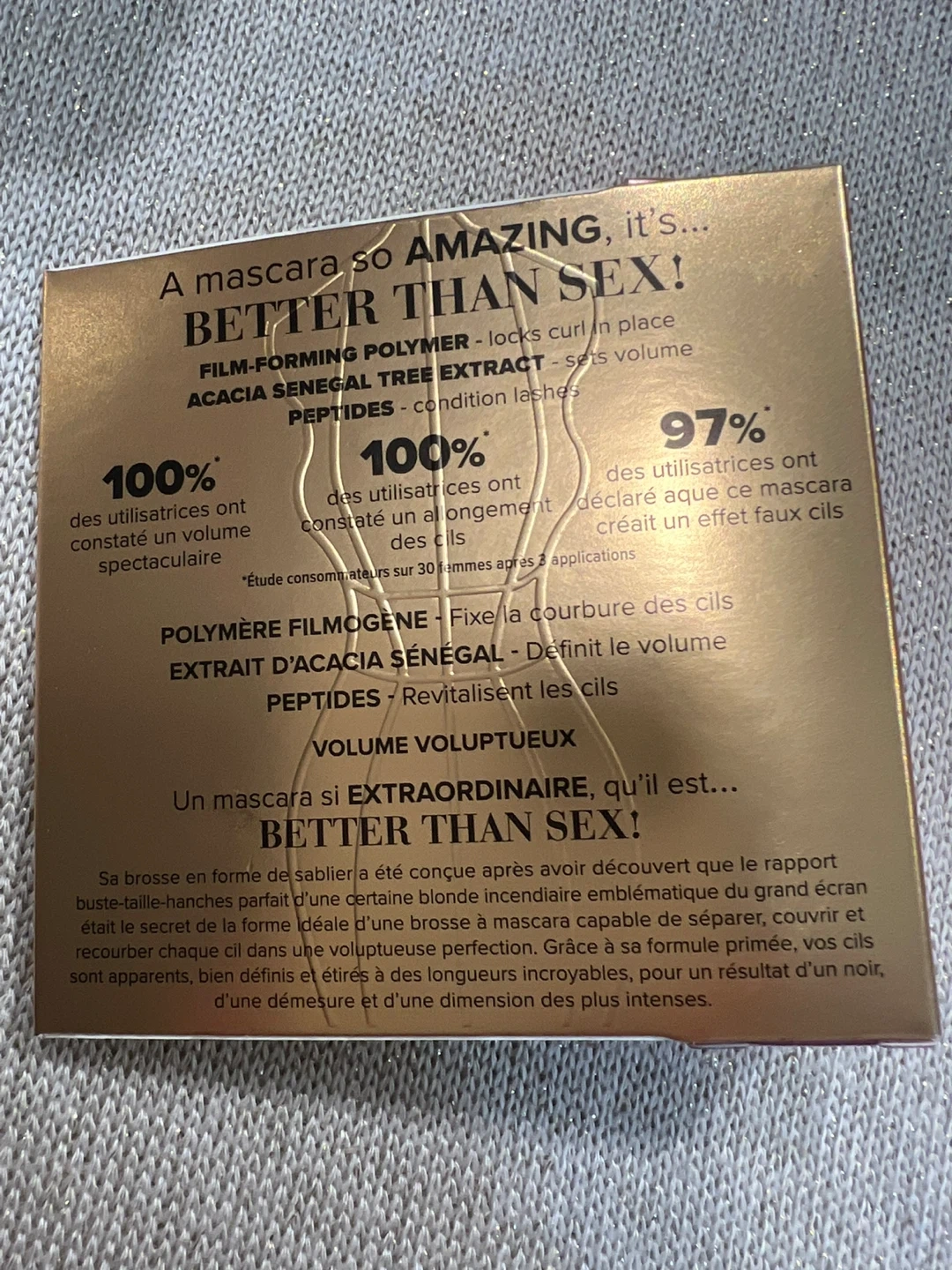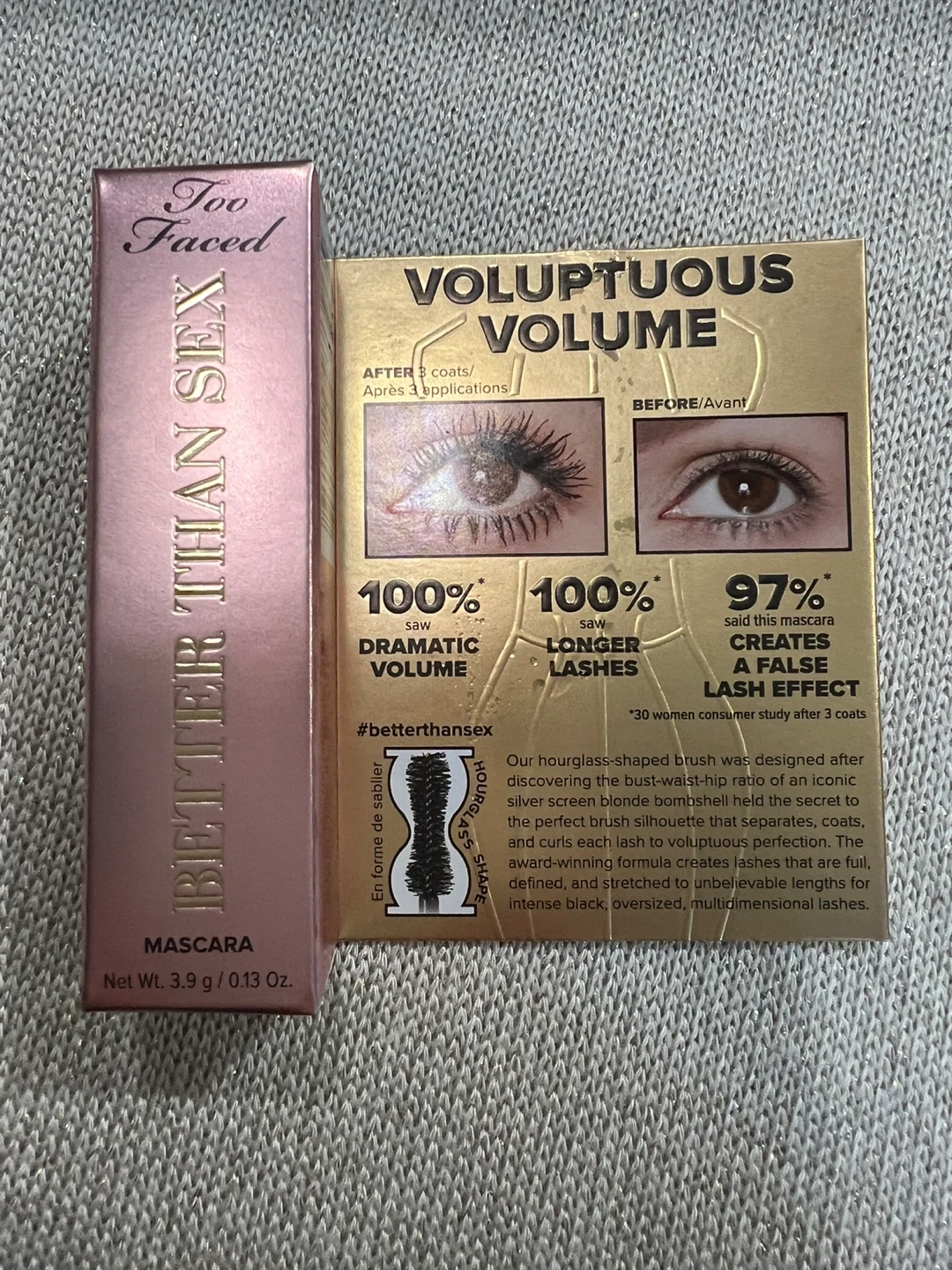 Too Faced Better Than Sex Mascara in mini size. Film-forming polymer locks curl in place. Acacia Senegal Tree extract for volume. Peptides condition lashes. Creates dramatic volume and longer lashes.