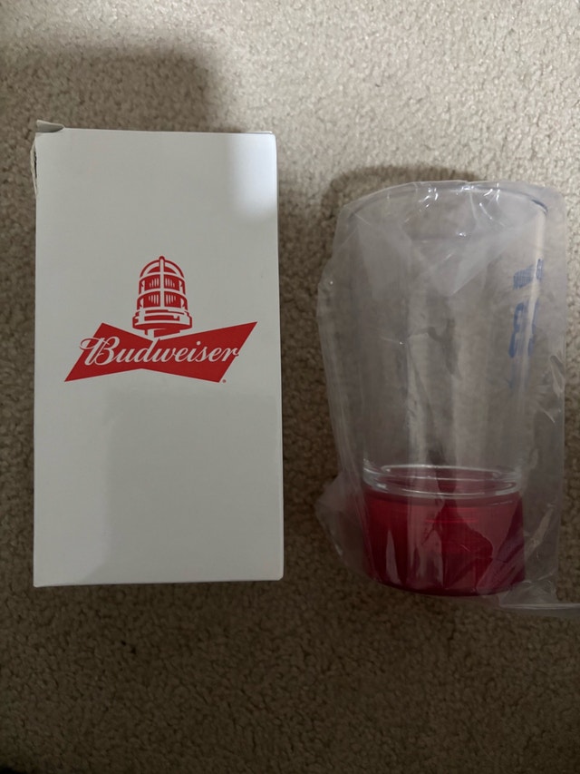 Add a touch of classic brewery style to your collection with this new Budweiser glass, still sealed in its original packaging. Perfect for the beer enthusiast or collector, this glass showcases the iconic Budweiser branding. * New in original packaging * Iconic Budweiser logo * Red base Asking $15. If you're reading this, yes, it's still available!