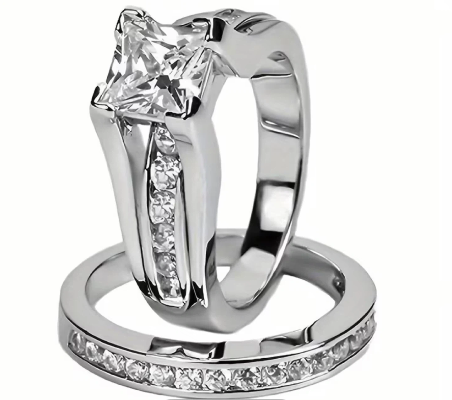 This is a princess cut engagement ring set with a matching band.