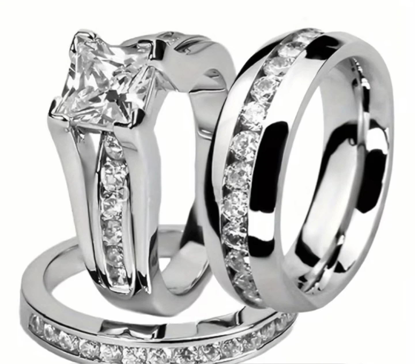 3pcs Elegant Couple Ring Set, Stainless Steel & Zinc Alloy with Zirconia Stones, Suitable for Wedding and Engagement.
