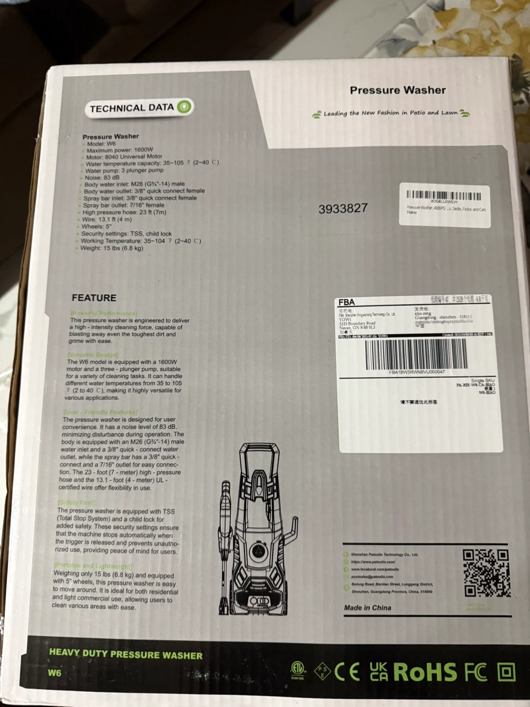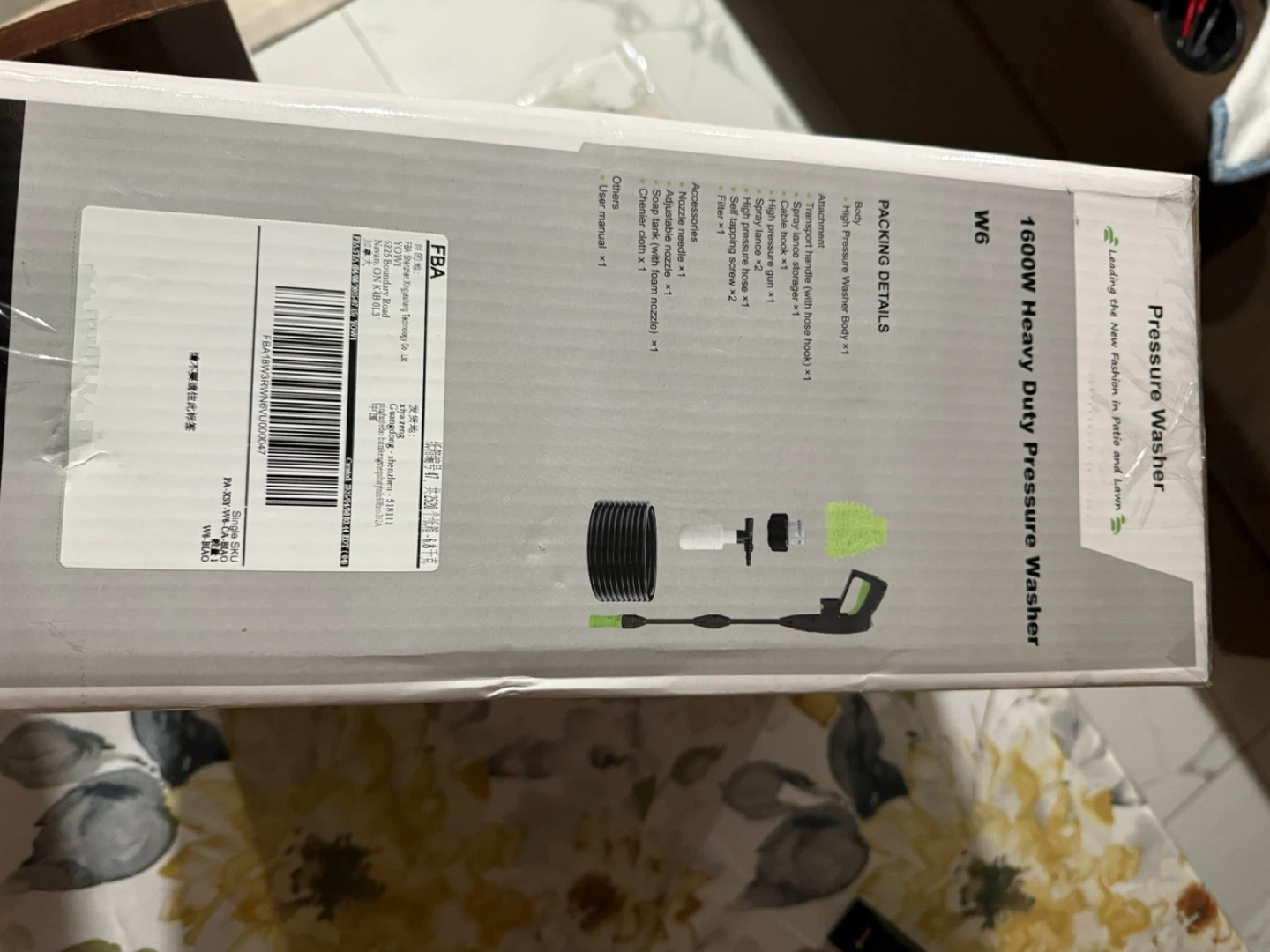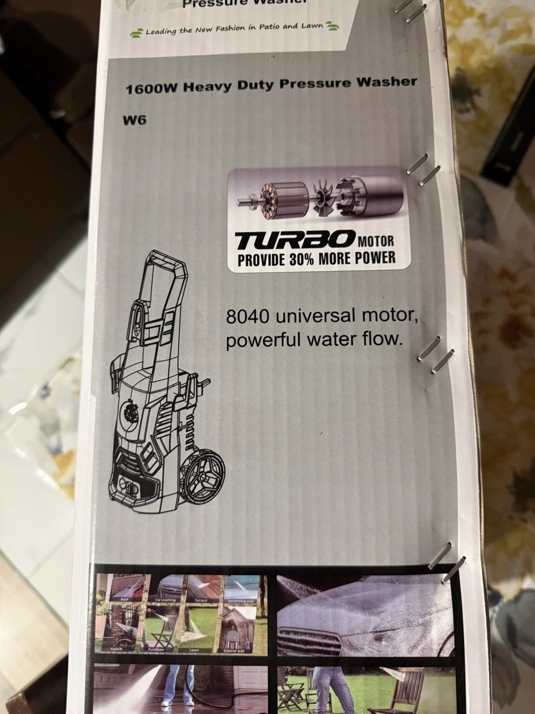 This is a 1600W heavy duty pressure washer with a 16 ft hose and a Turbo Motor for more power. It's designed for cleaning various home exterior surfaces. Includes essential accessories for immediate use.