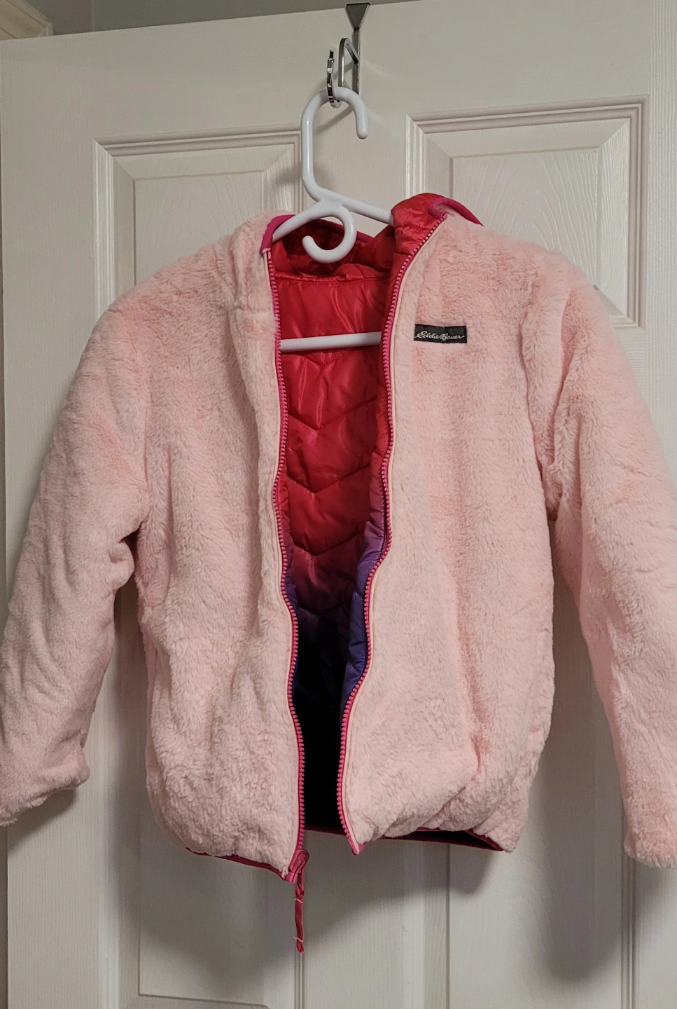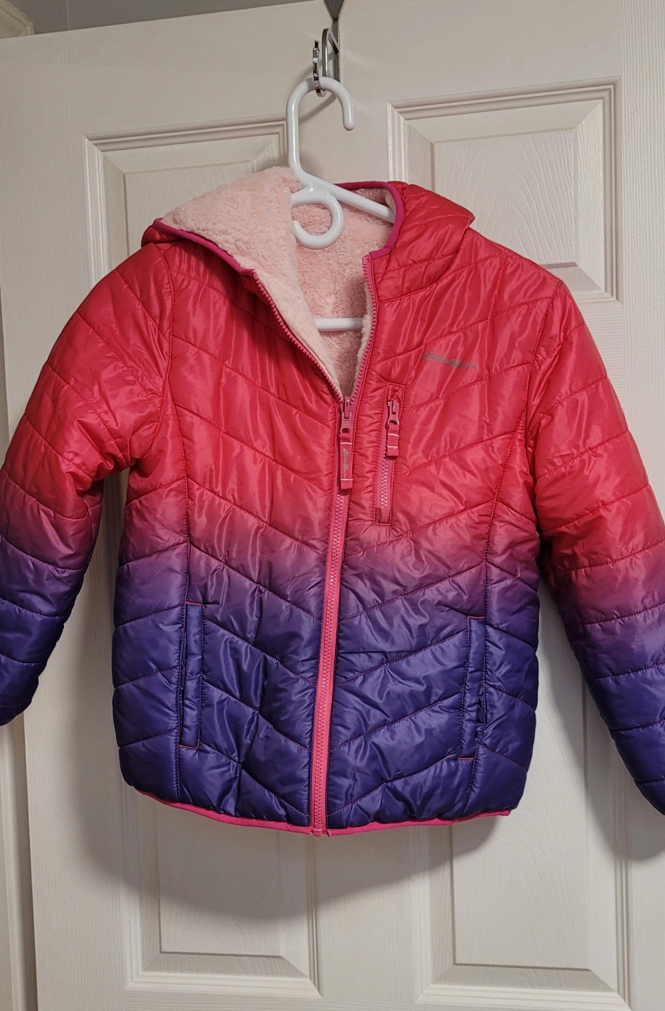 Reversible pink fluffy and ombre pink/purple puffer jacket. Zip-up closure. Suitable for colder weather. Great for layering.