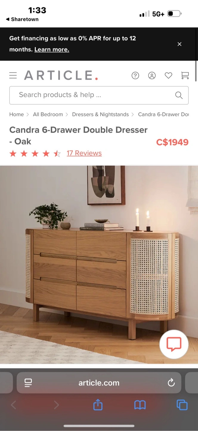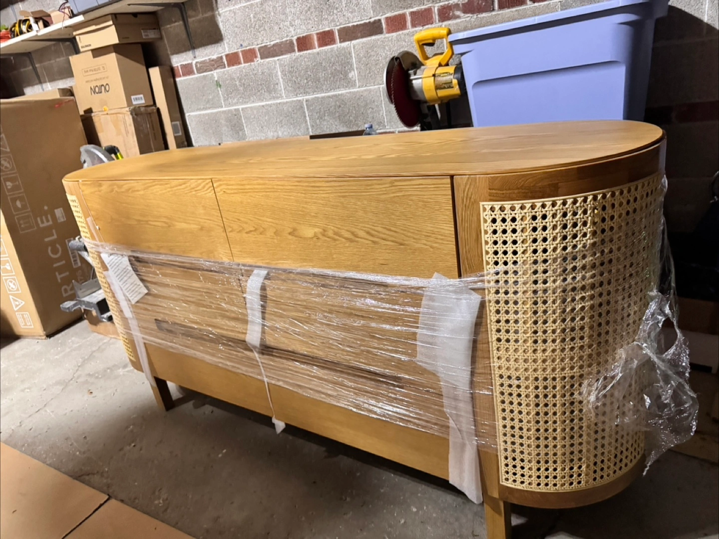 A beautiful dresser with six drawers. It has a wooden frame with woven cane detailing on the sides. It is perfect for storing clothes and other belongings while bringing a warm and calming ambience to any bedroom.