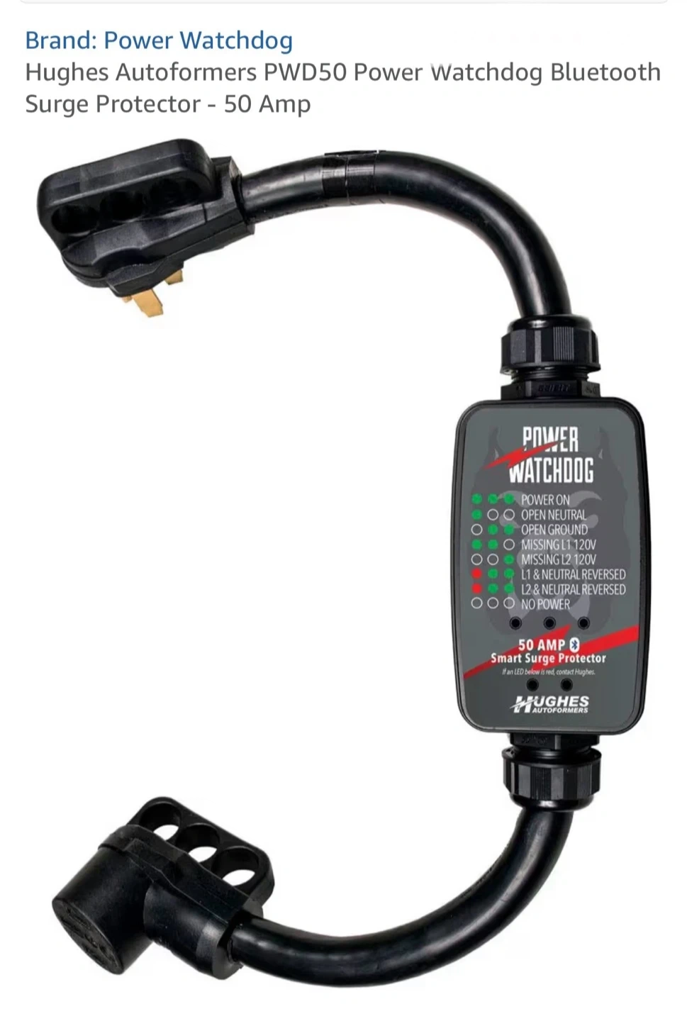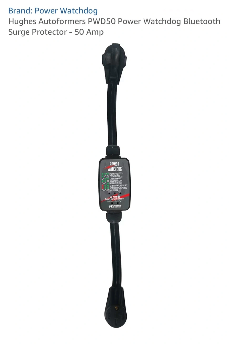 This is a Hughes Auttoformers Power Watchdog PWD50 Bluetooth Smart Surge Protector. It's 50 Amp rated and connects via Bluetooth to monitor power. It has LEDs to indicate power status and potential issues.