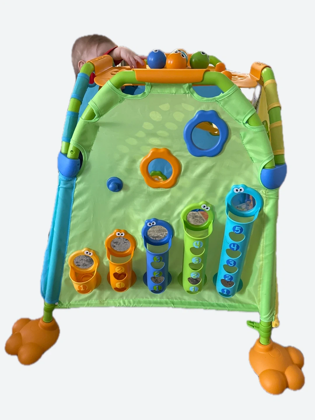 Activities include ball play, shape sorting, peek-a-boo games, and a ball roller-coaster run with five colorful rattling balls.