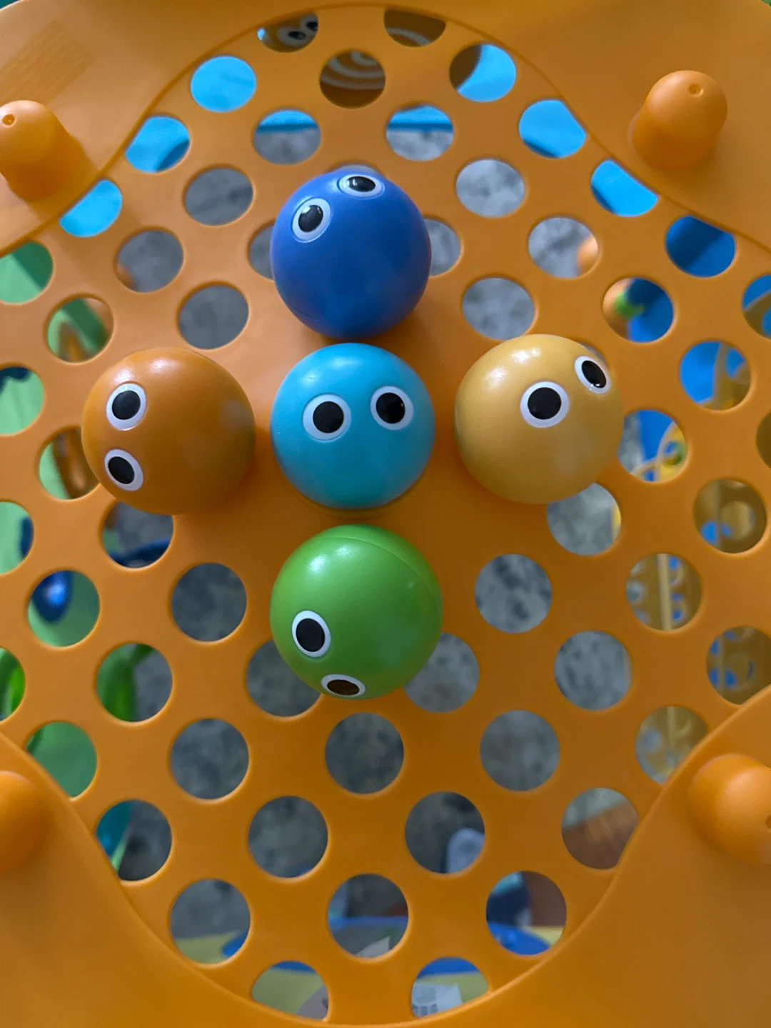 Activities include ball play, shape sorting, peek-a-boo games, and a ball roller-coaster run with five colorful rattling balls.