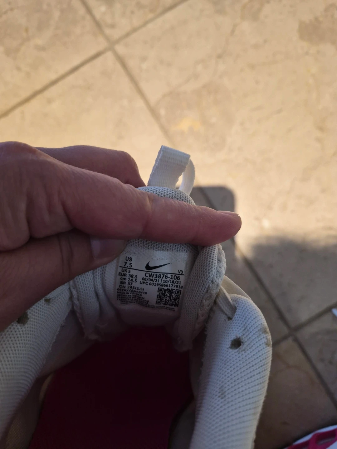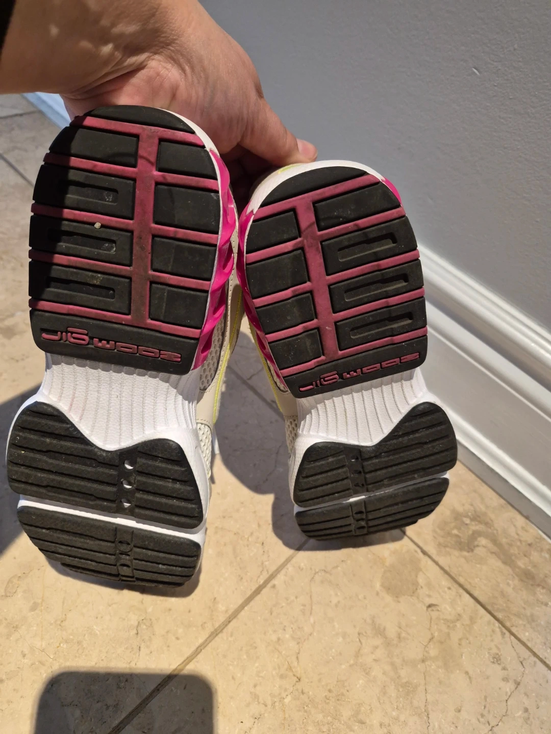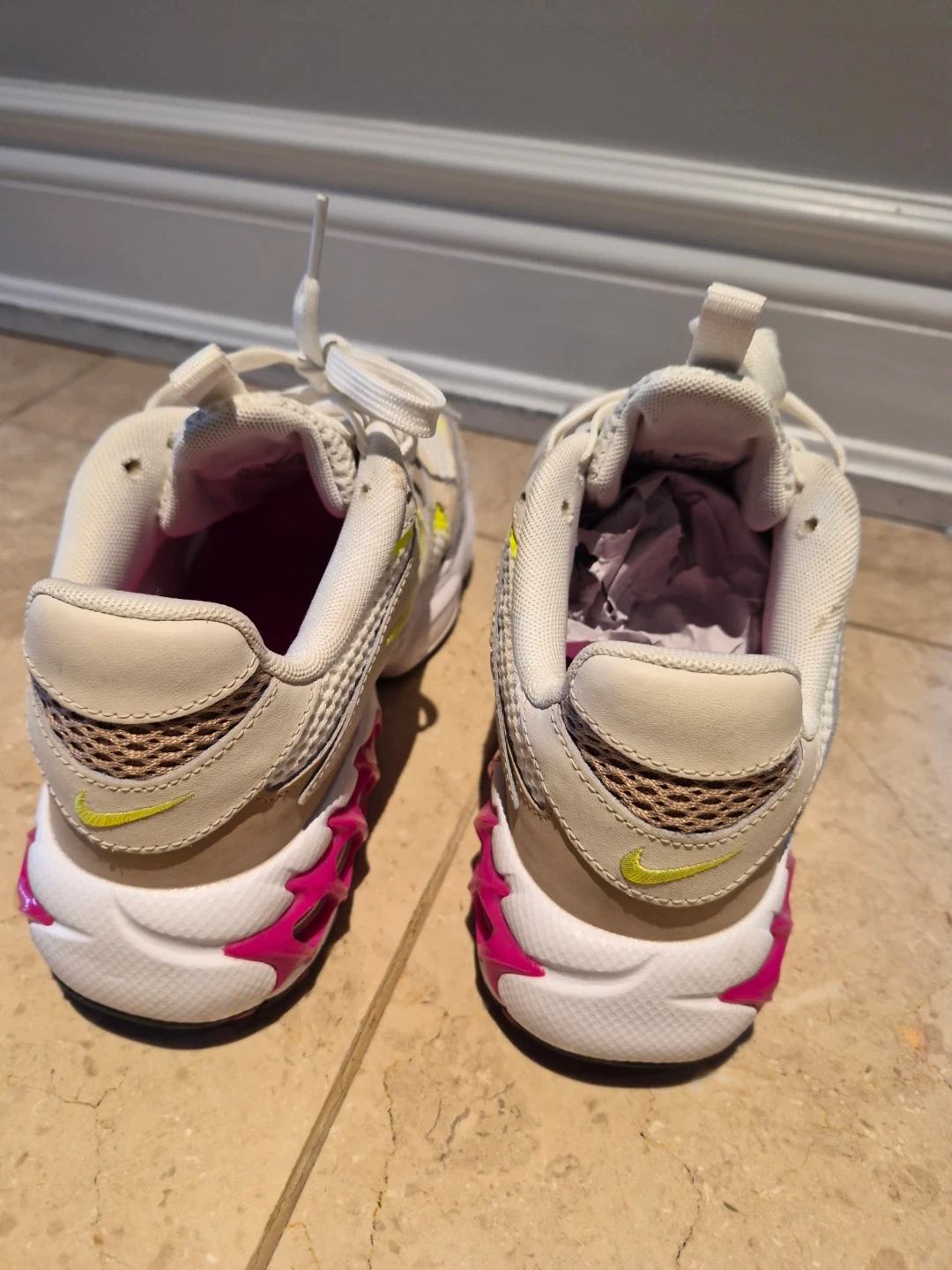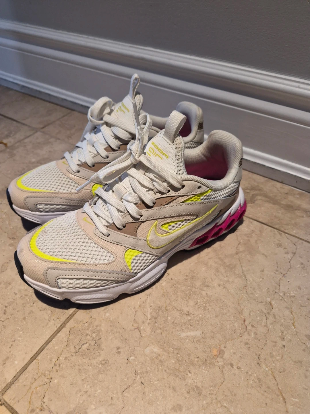 Almist brand new Nike women's running shoes with Zoom Air cushioning. The shoes are primarily white with neon yellow and hot pink accents. They are a US size 7.5.