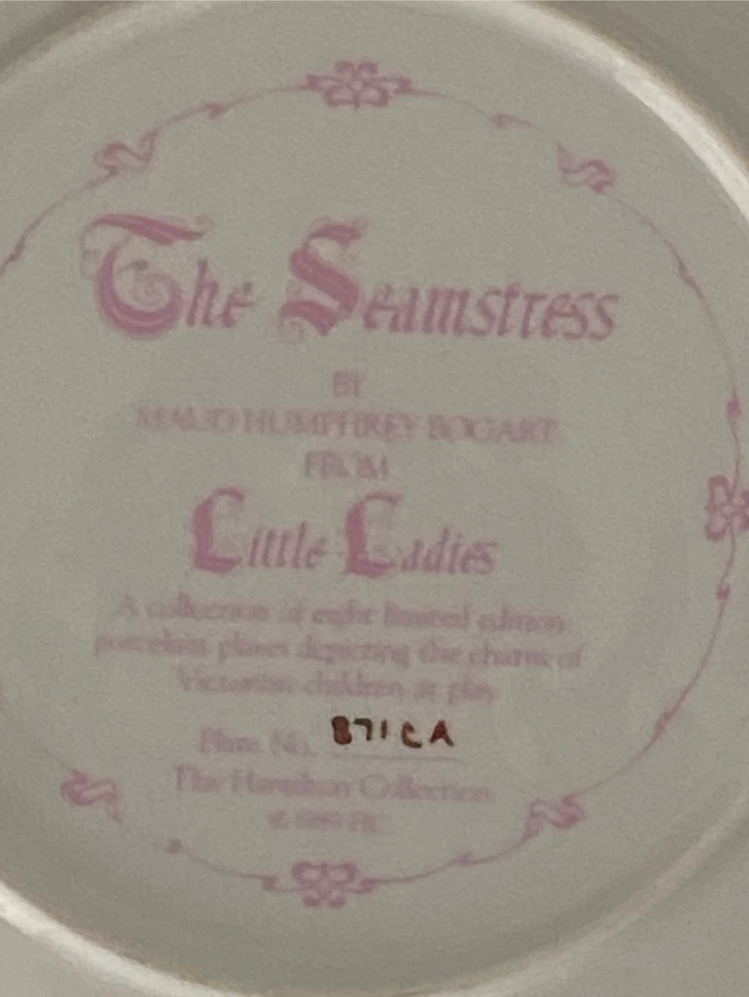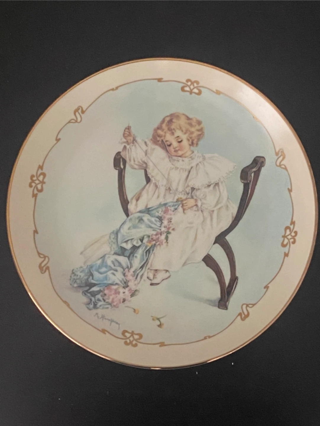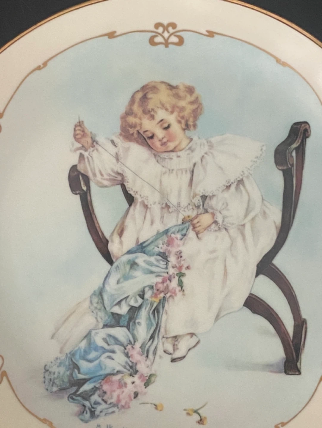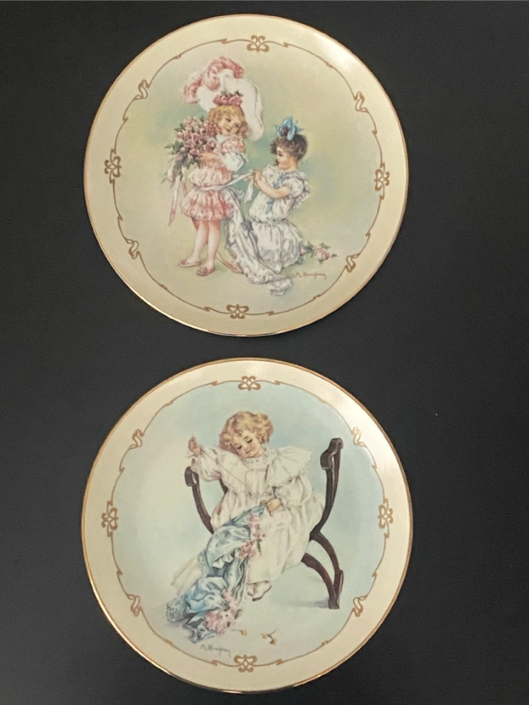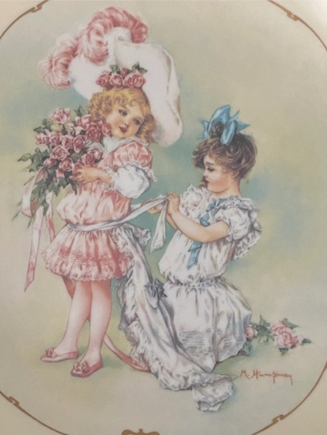 Two limited edition porcelain plates from The Hamilton Collection, "Playing Bridesmaid" and "The Seamstress," featuring artwork by Maud Humphrey Bogart (Humphrey Bogarts Mom) from the "Little Ladies" collection.