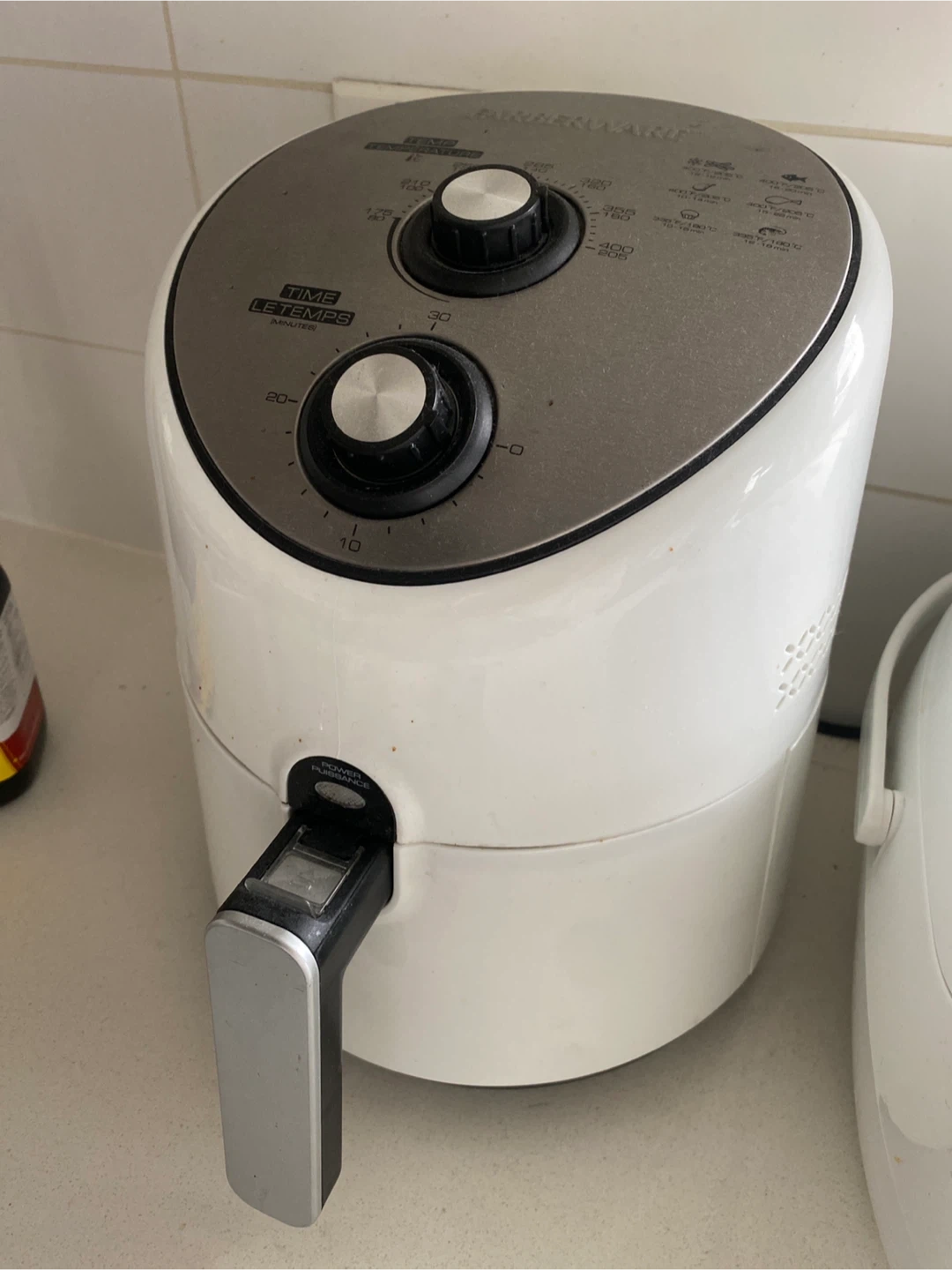 White Tupperware air fryer with two control knobs for time and temperature. It has a removable basket handle. Includes cooking temperature and time suggestions on the top panel.