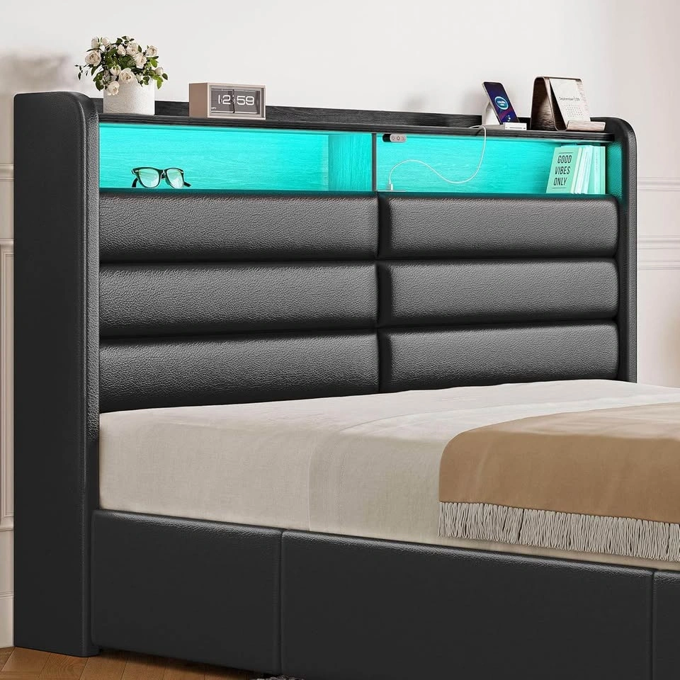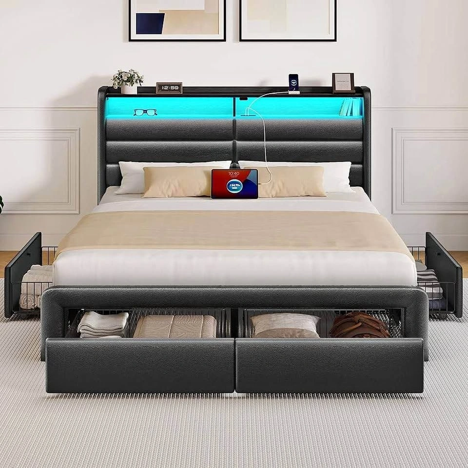 Brand New in Box. Full-size upholstered platform bed frame with 4 spacious storage drawers and a storage shelf in the headboard. Features built-in charging station with 2 USB and 1 Type-C port. Includes customizable RGB LED lighting controllable by remote or app. Heavy-duty construction with 12 support slats and 9 legs, supporting up to 1200 lbs. Designed for noise-free sleep and does not require a box spring. Recommended mattress thickness is 6-10 inches. Assembly takes under 90 minutes with included guide and labeled parts. Mattress not included. Feel free to message if you have any questions!