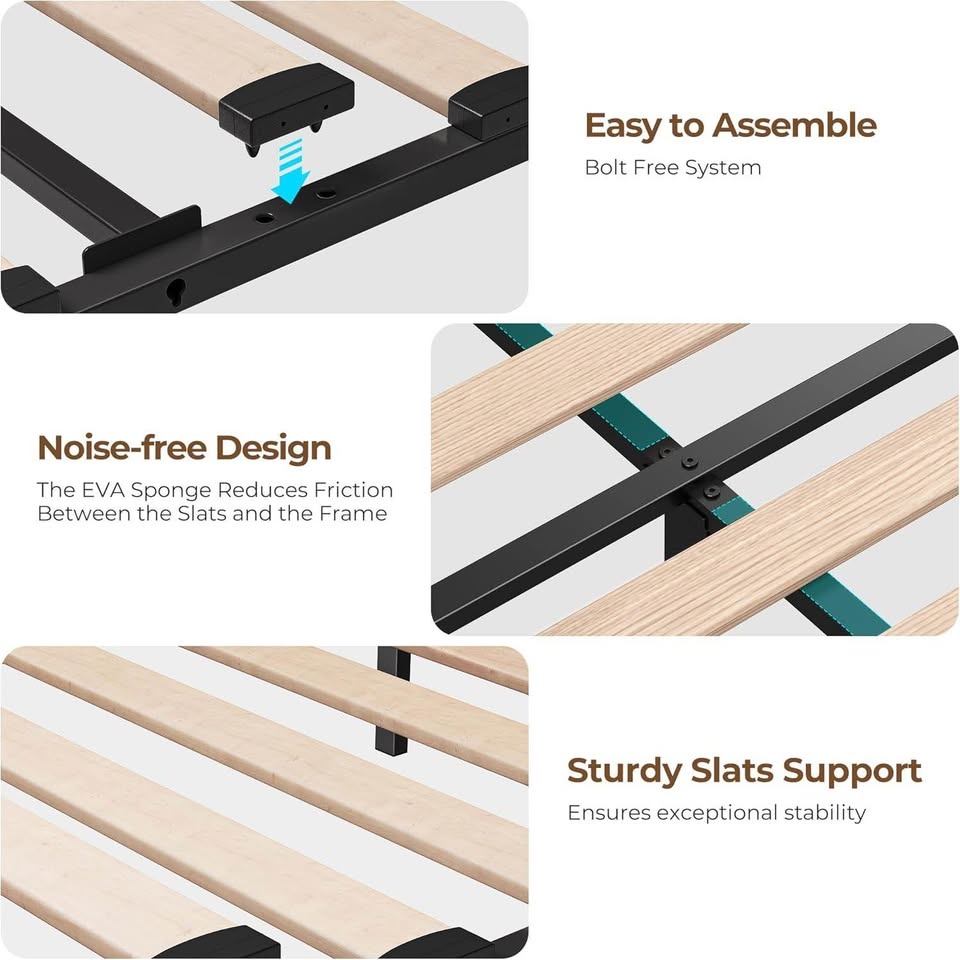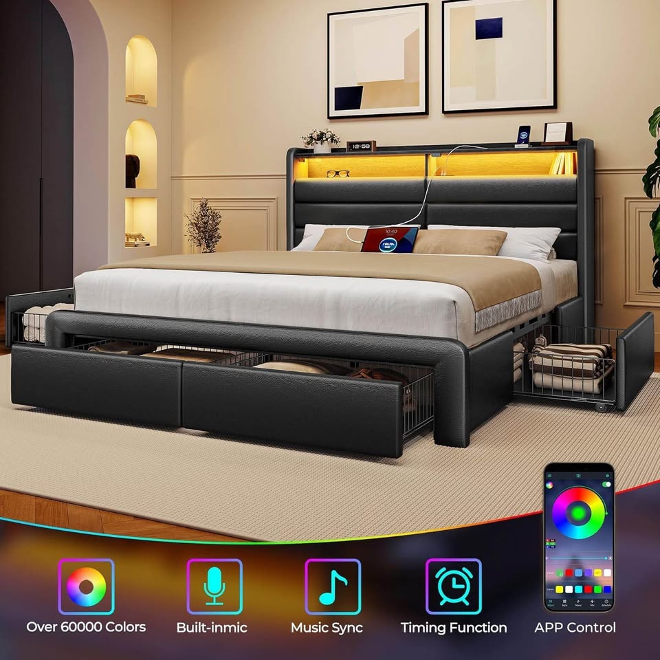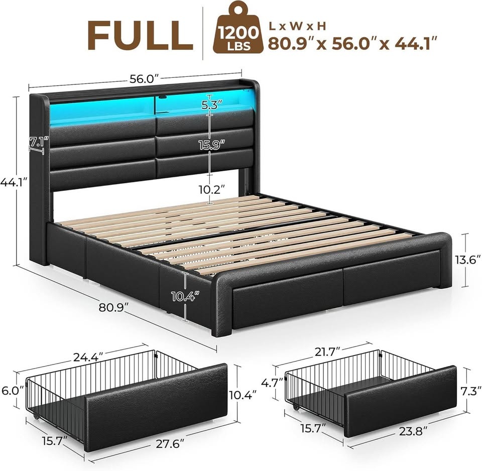 Brand New in Box. Full-size upholstered platform bed frame with 4 spacious storage drawers and a storage shelf in the headboard. Features built-in charging station with 2 USB and 1 Type-C port. Includes customizable RGB LED lighting controllable by remote or app. Heavy-duty construction with 12 support slats and 9 legs, supporting up to 1200 lbs. Designed for noise-free sleep and does not require a box spring. Recommended mattress thickness is 6-10 inches. Assembly takes under 90 minutes with included guide and labeled parts. Mattress not included. Feel free to message if you have any questions!