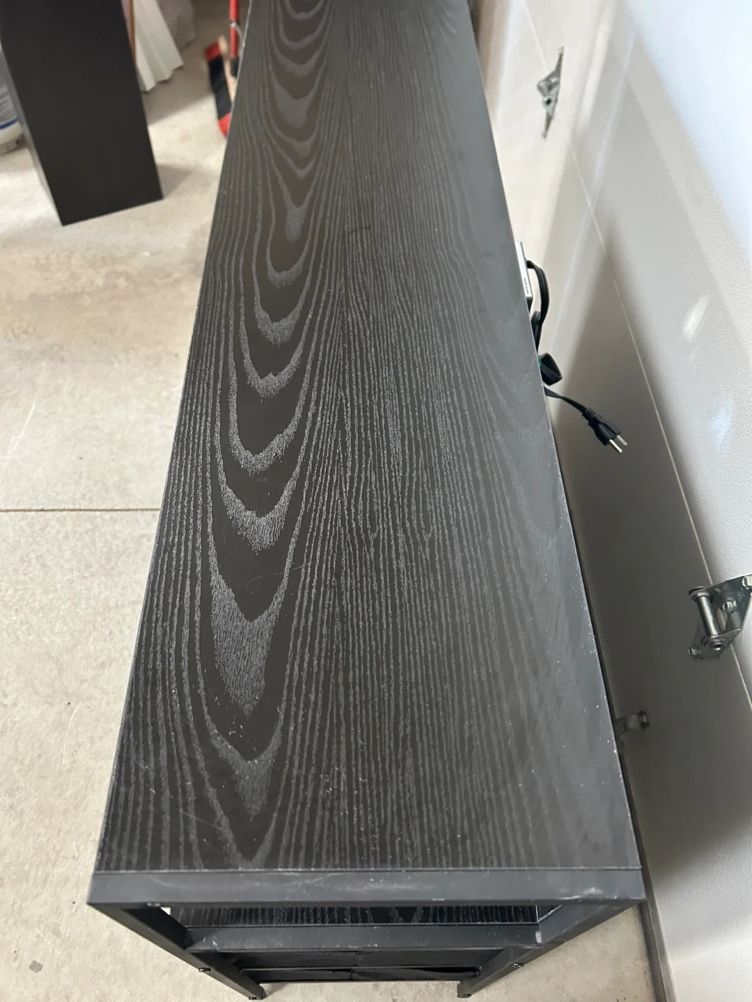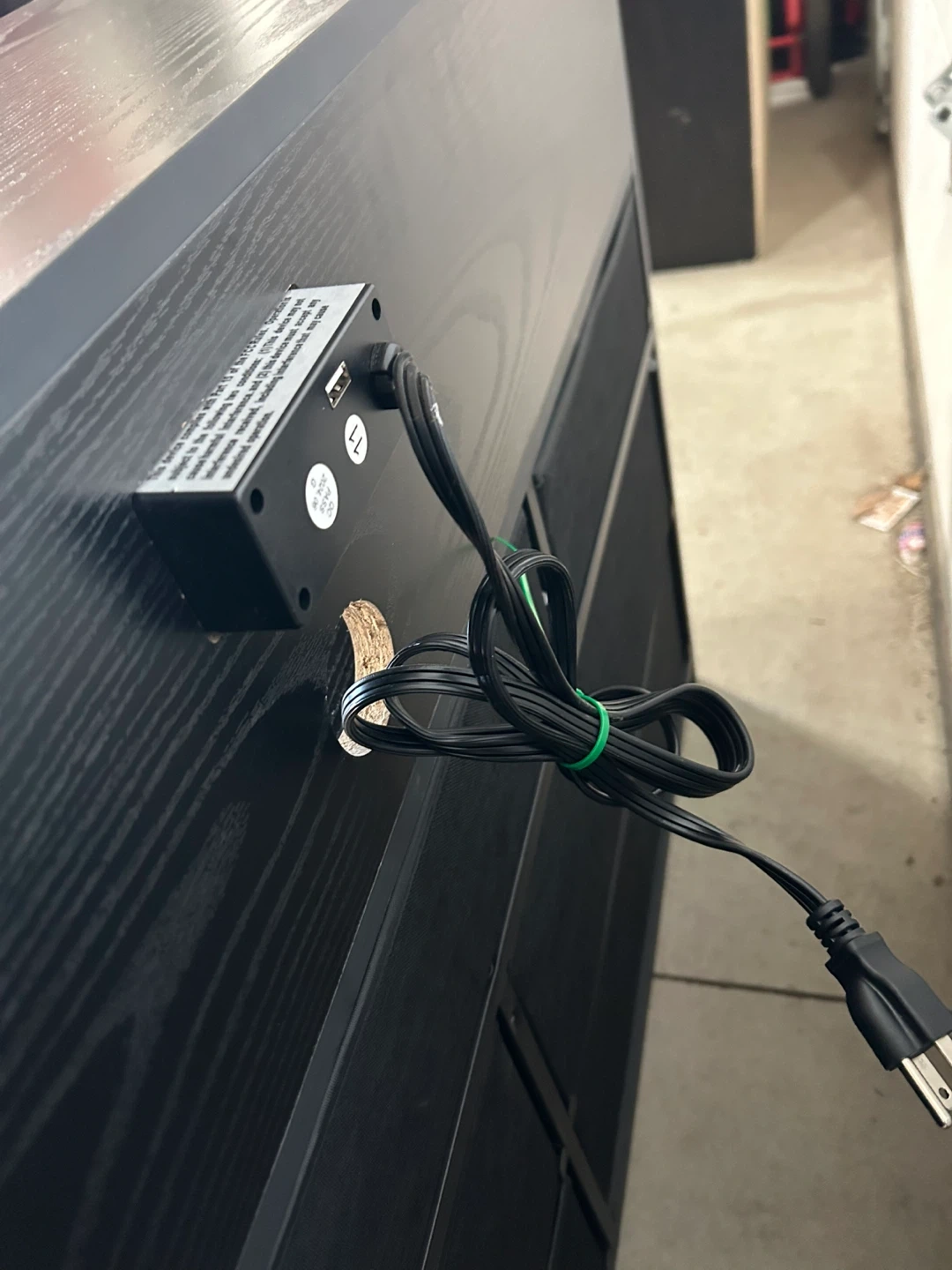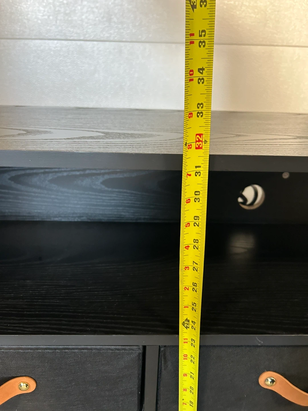 Black dresser with seven fabric drawers and faux leather pull tabs. The top surface is black wood grain. Includes power cord for possible LED lights or charging. Width measures approximately 47 inches.