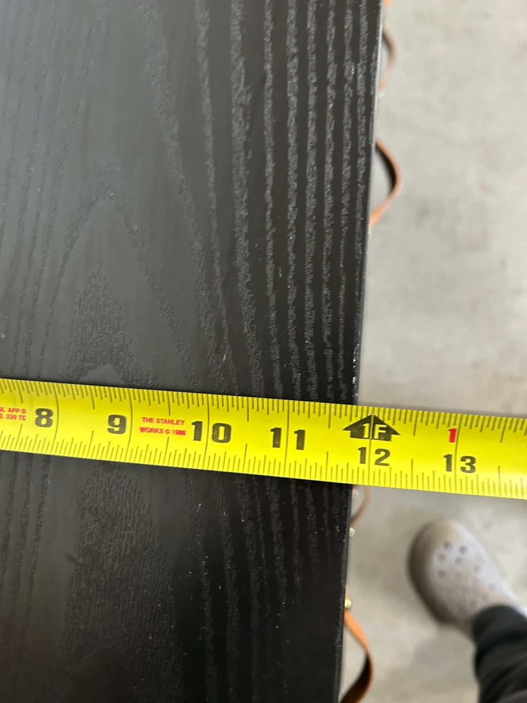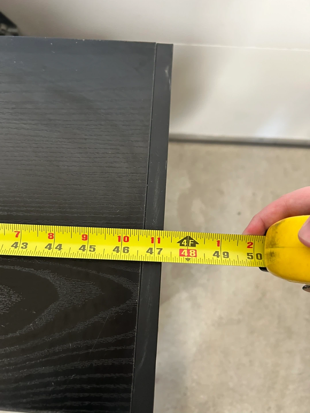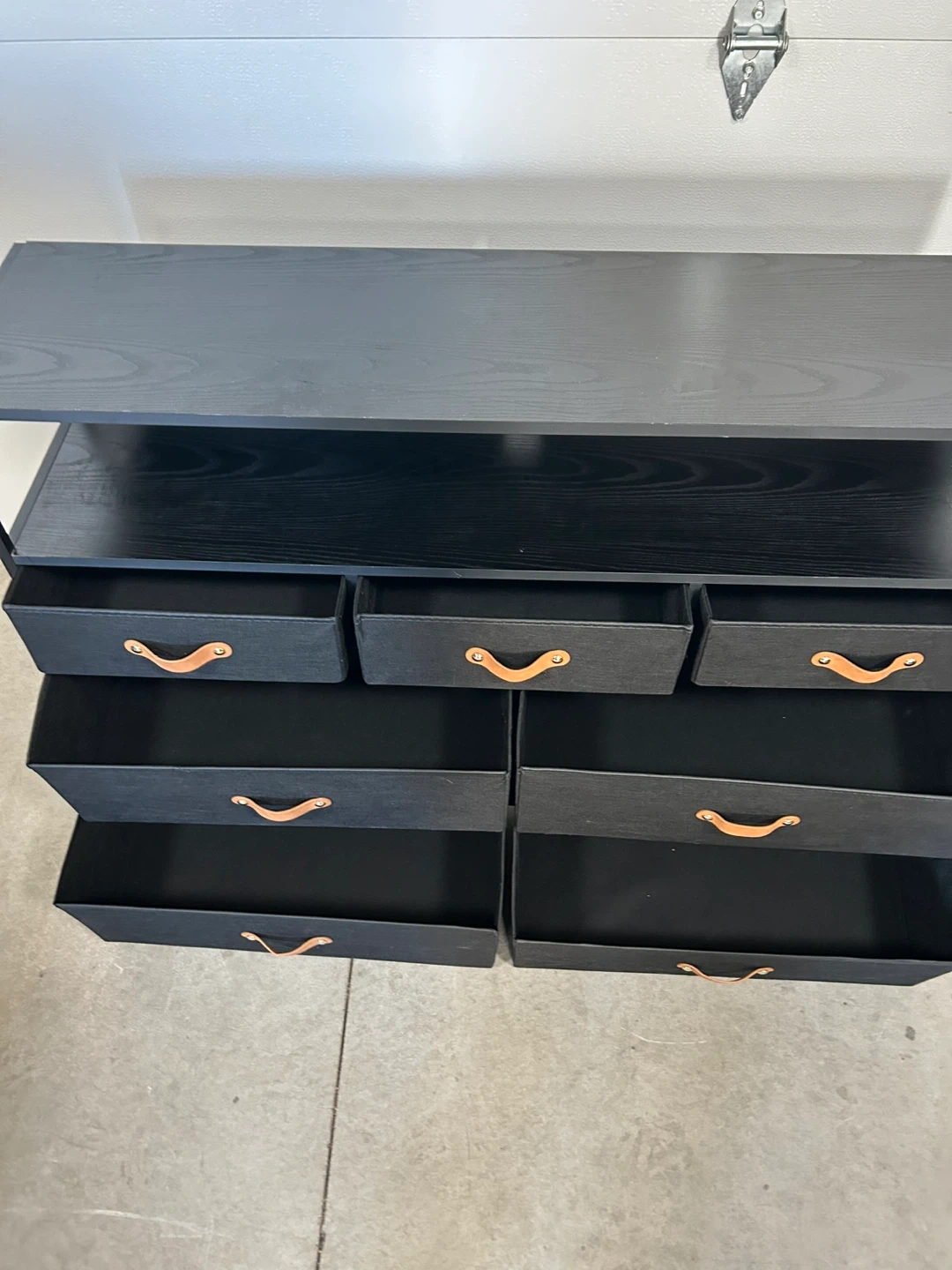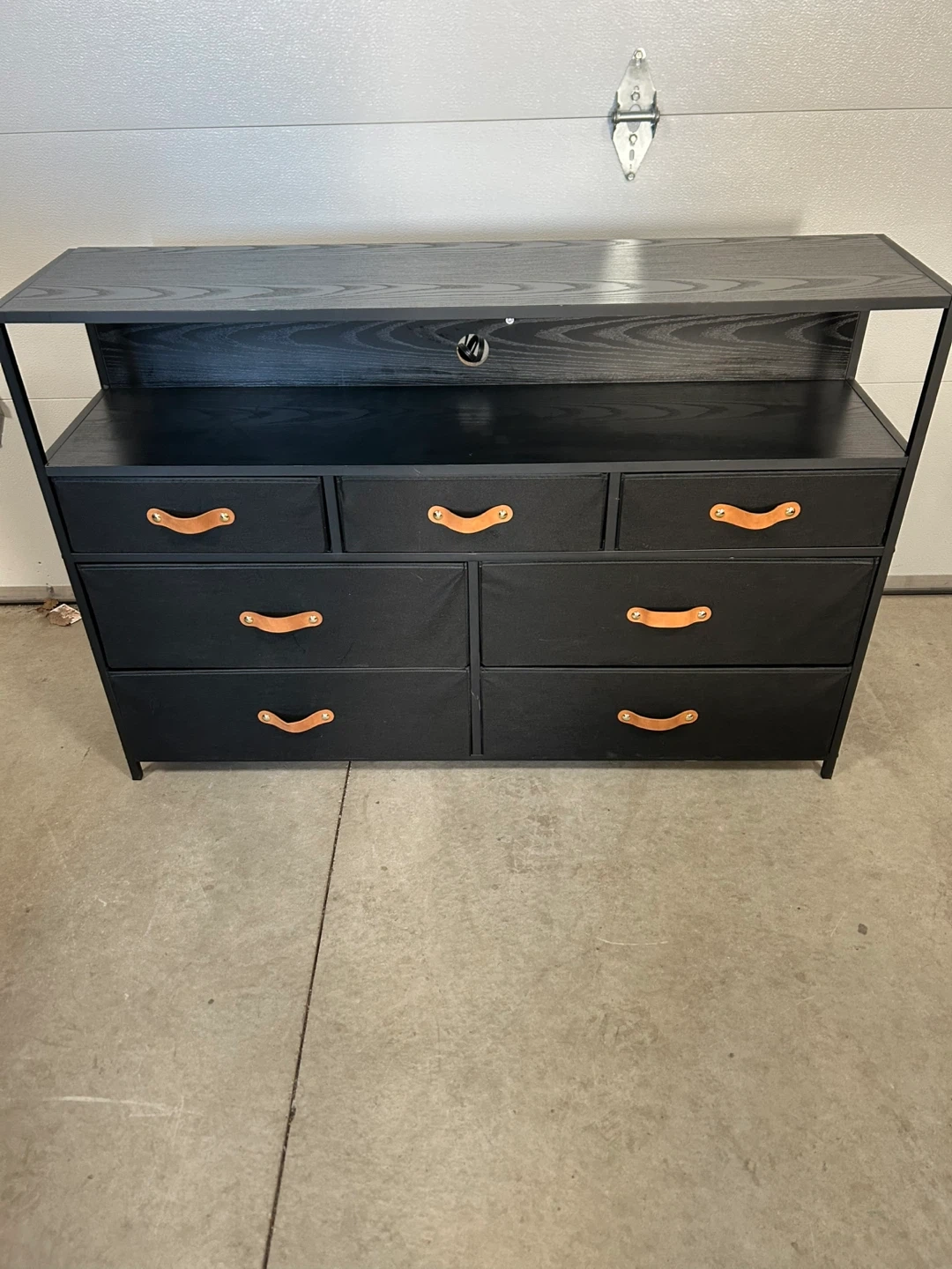 Black dresser with seven fabric drawers and faux leather pull tabs. The top surface is black wood grain. Includes power cord for possible LED lights or charging. Width measures approximately 47 inches.