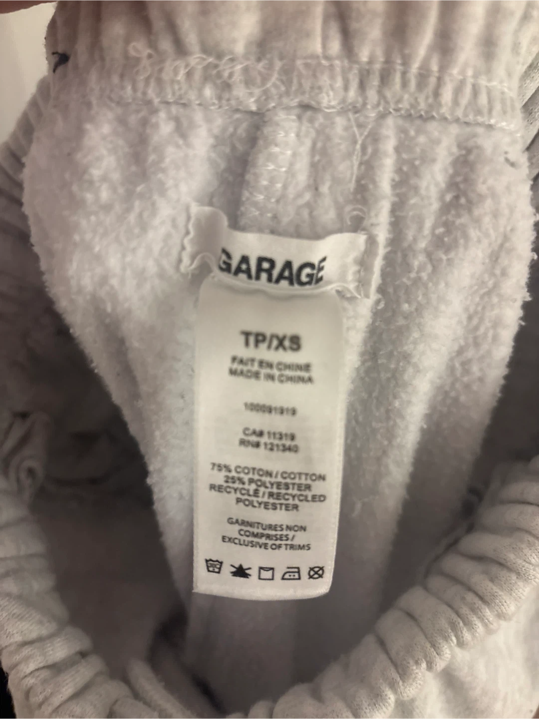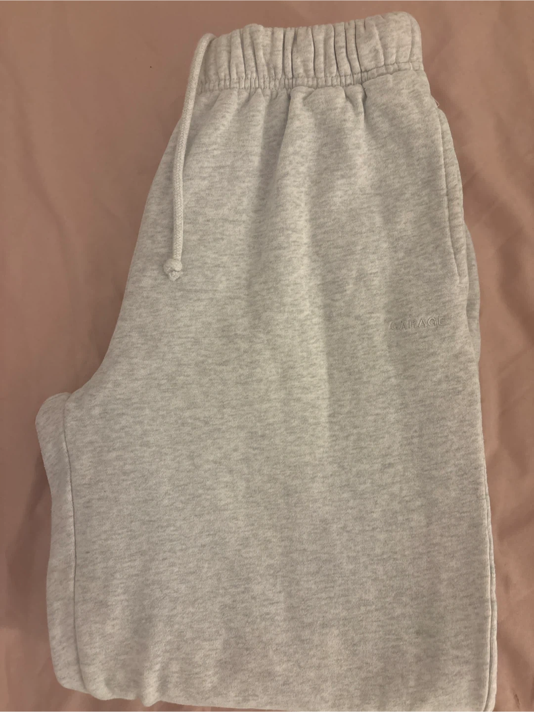 Comfy grey sweatpants from Garage. They're made with a 75% cotton and 25% polyester blend. Perfect for lounging around!