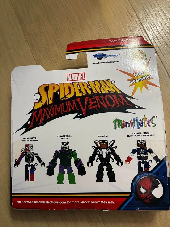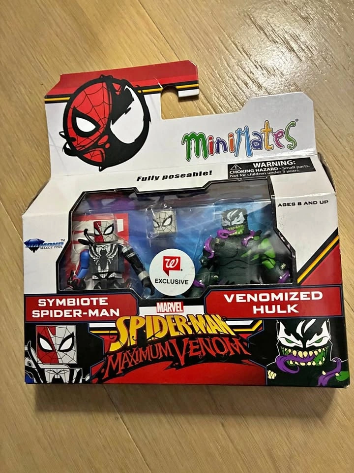 This is a Marvel Minimates Spider-Man Maximum Venom 2-pack featuring Symbiote Spider-Man and Venomized Hulk. This set was a Walgreens exclusive. The figures are fully poseable and include an alternate Spider-Man head accessory. It is inspired by the Spider-Man animated show on Disney XD. The figures were produced by Diamond Select Toys. Available only in the USA.