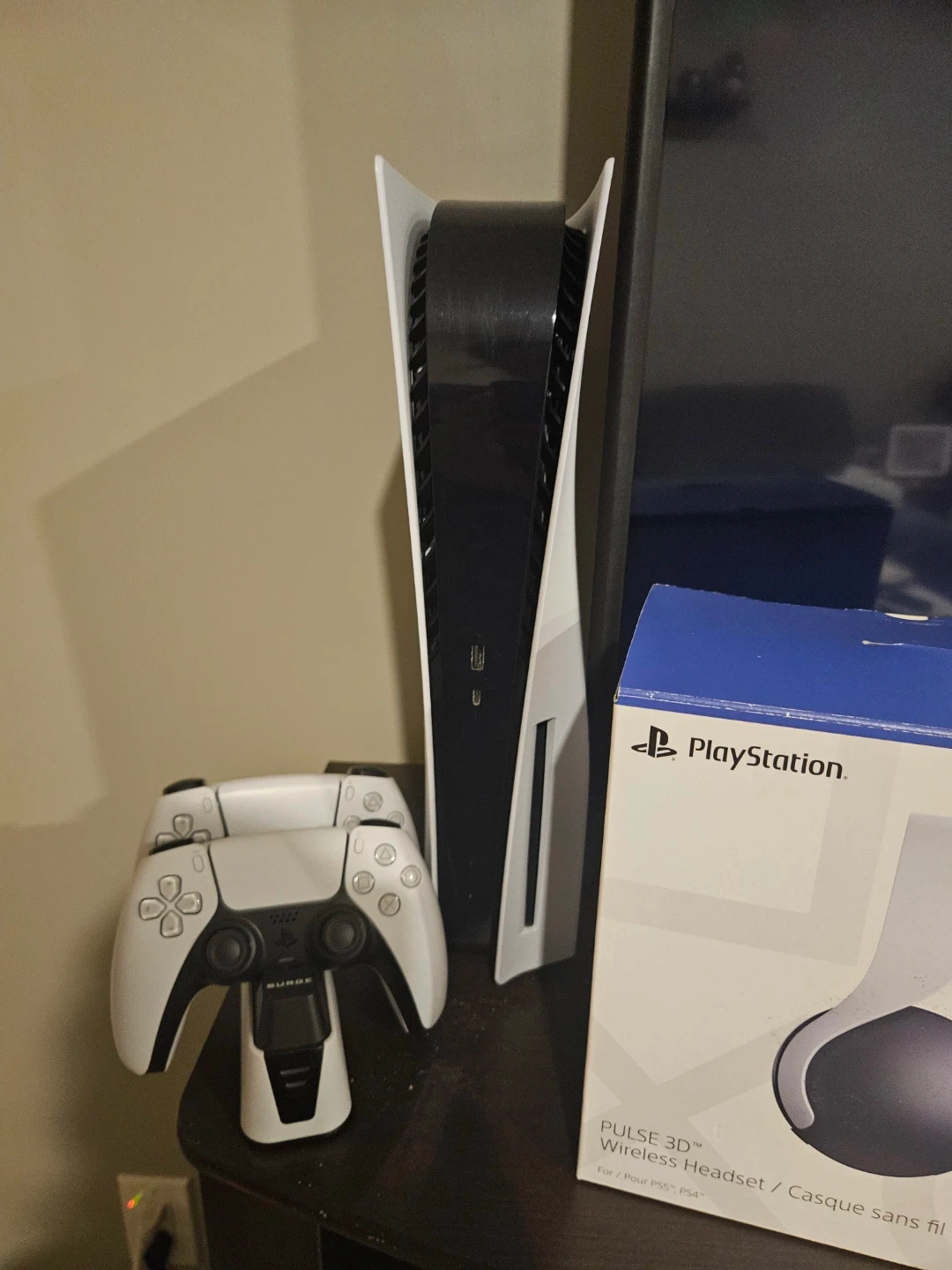 PlayStation 5 console bundle. It includes two DualSense wireless controllers and a Pulse 3D wireless headset for PS5 and PS4. Have all the original boxes except for the charging station.