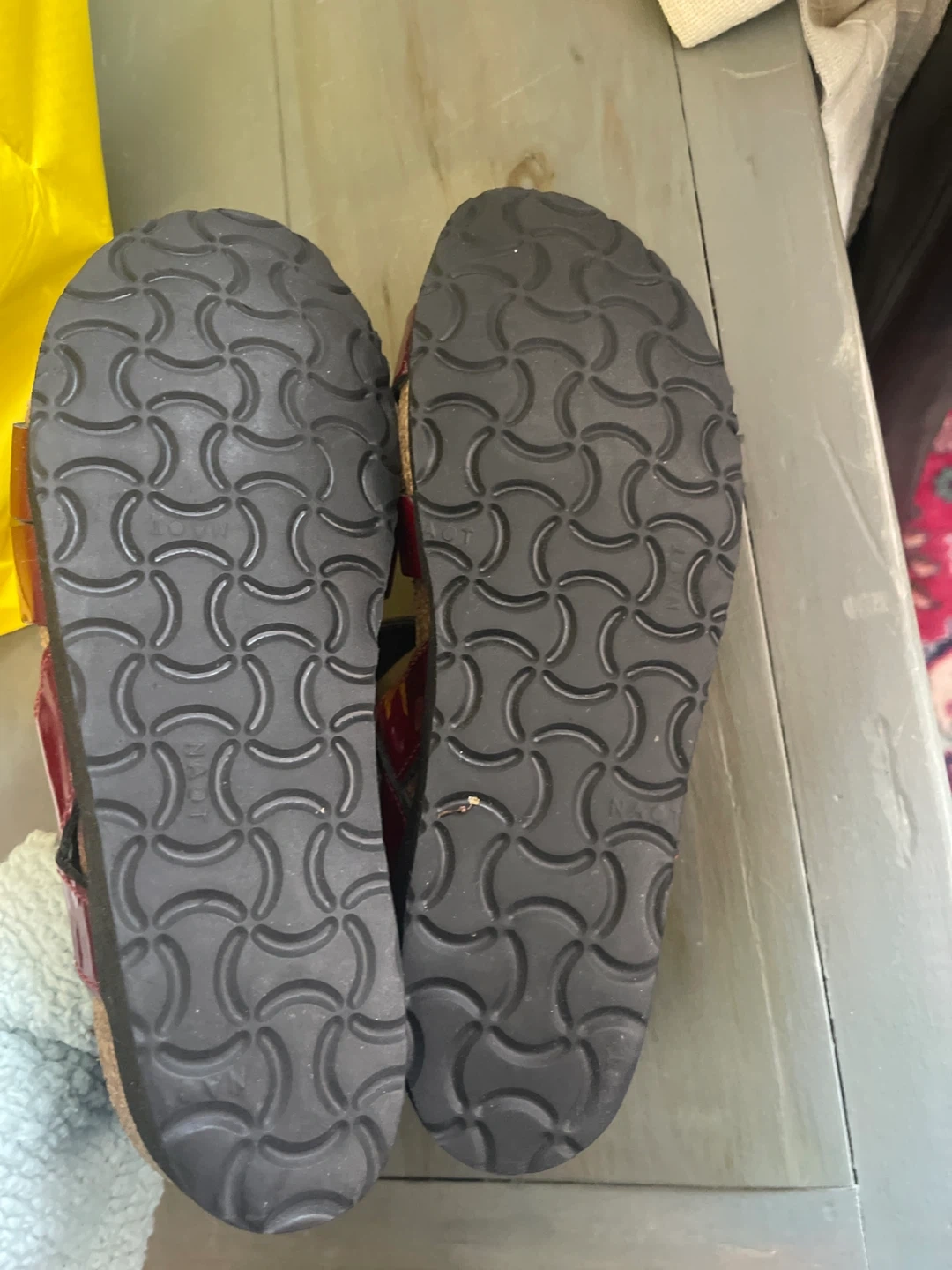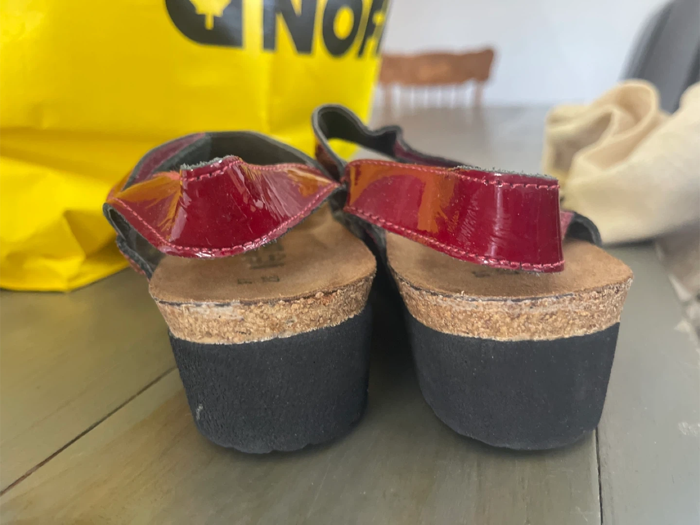 These Naot sandals feature a stylish red patent leather design. They are made in Israel and have a cork footbed for comfort. The size is 37.