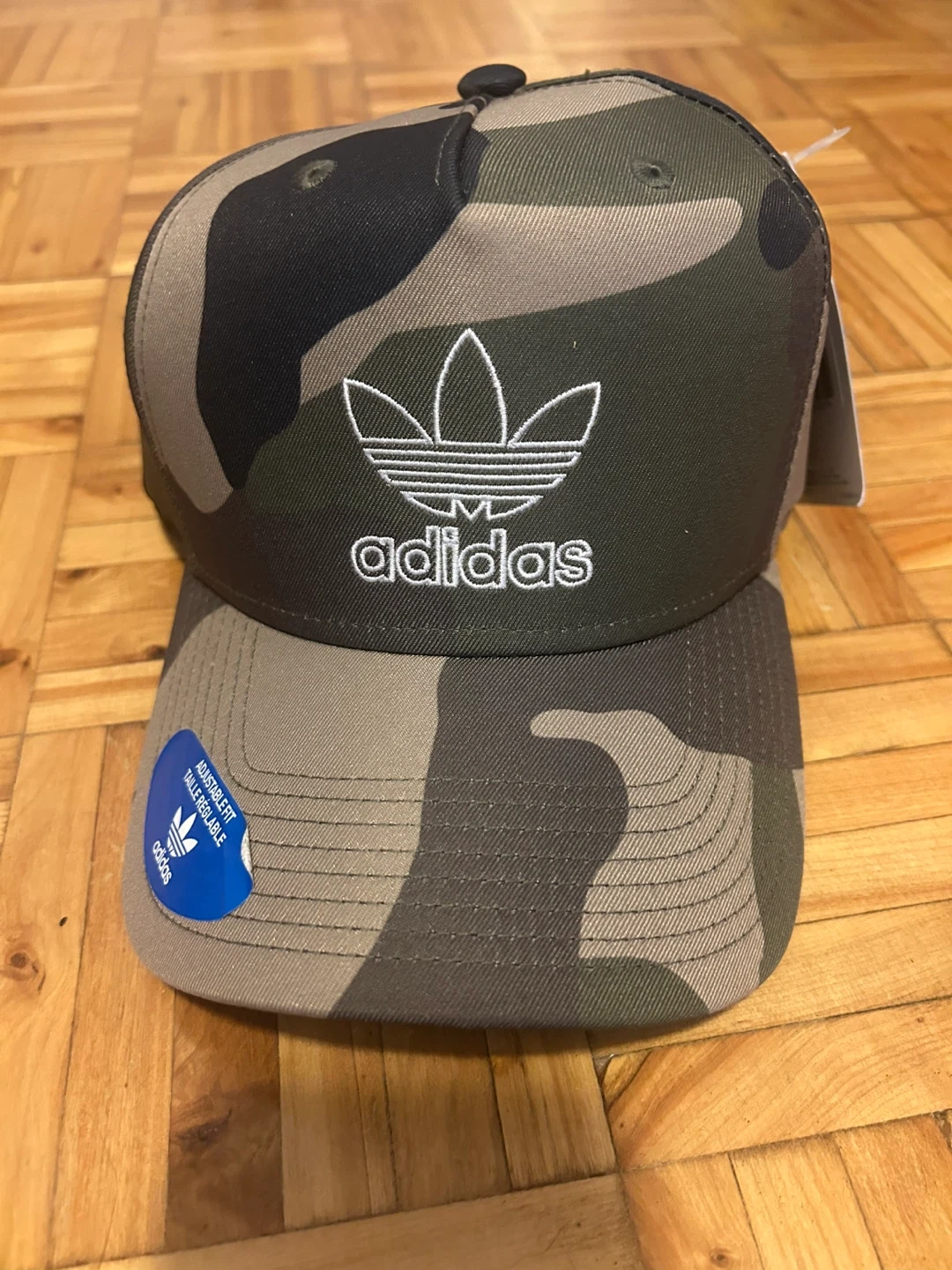 Brand new (with tags and cardboard shape saver) Adidas curved brim snapback hat with a camo pattern. Features the iconic Adidas trefoil logo embroidered on the front. It's an adjustable fit for most head sizes. Perfect for casual wear or outdoor activities!
