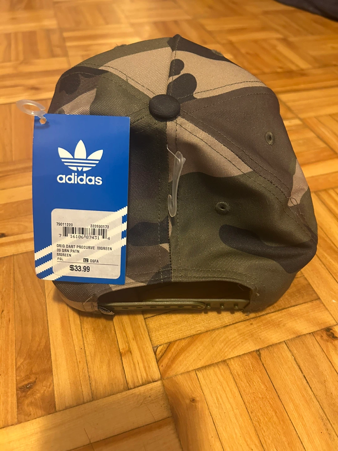 Brand new (with tags and cardboard shape saver) Adidas curved brim snapback hat with a camo pattern. Features the iconic Adidas trefoil logo embroidered on the front. It's an adjustable fit for most head sizes. Perfect for casual wear or outdoor activities!