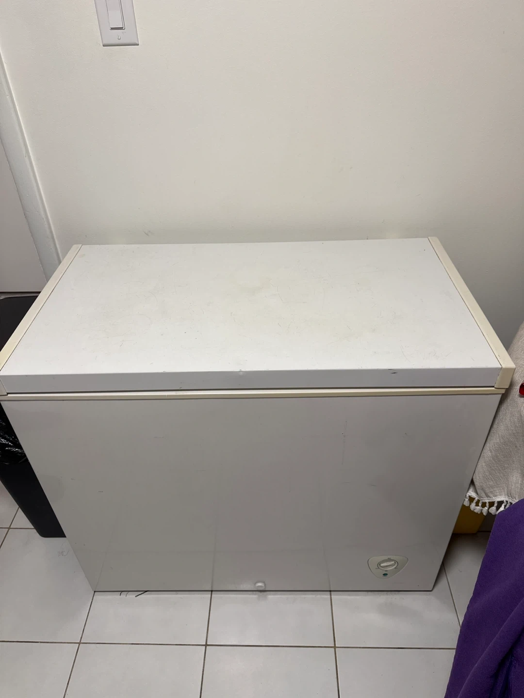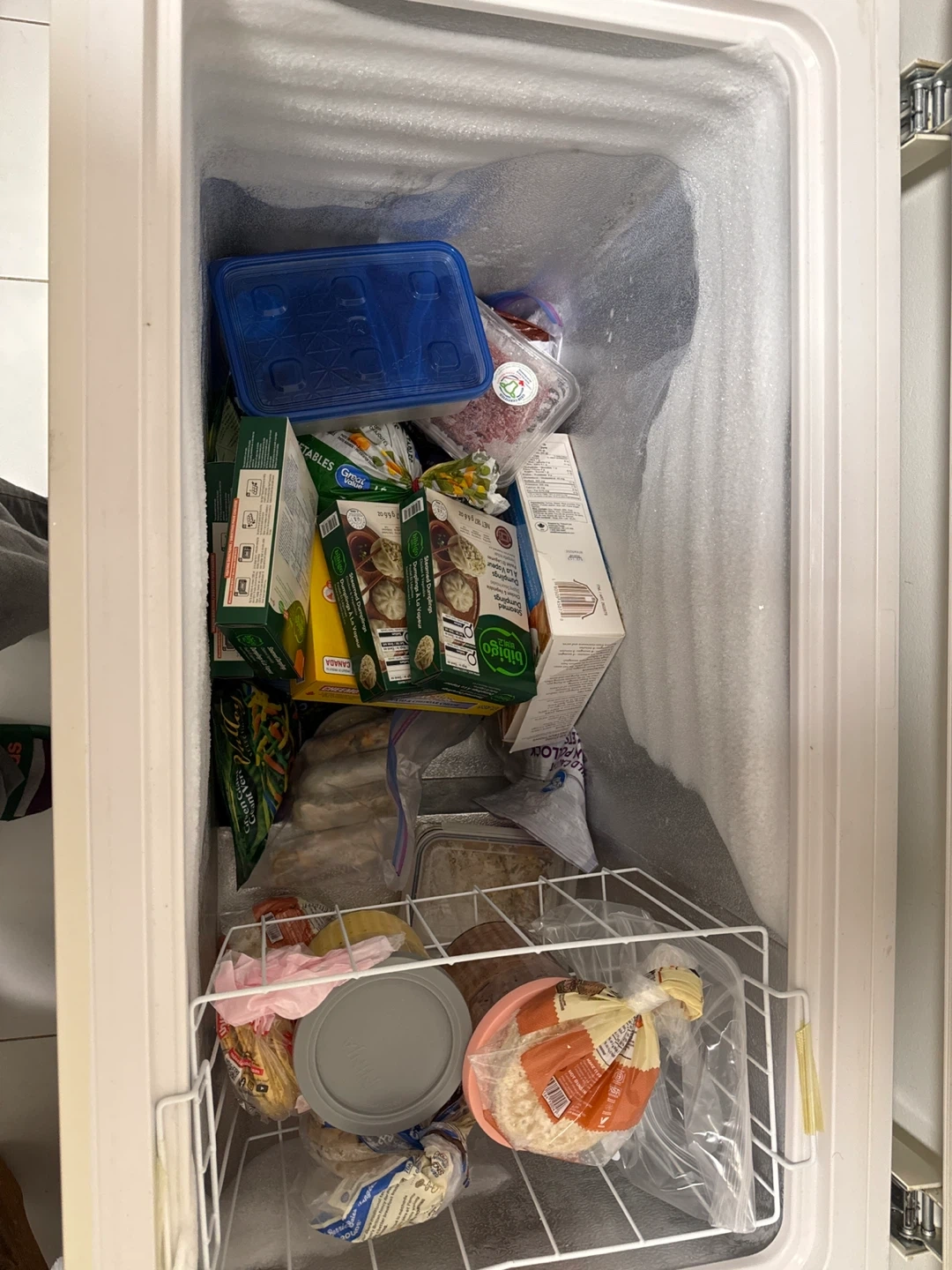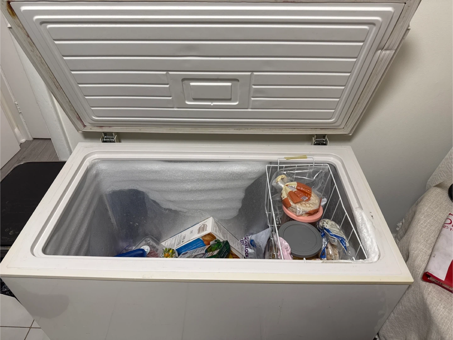 This is a white chest freezer. It's a great appliance for storing frozen goods. It comes with a wire basket to help organize your items.