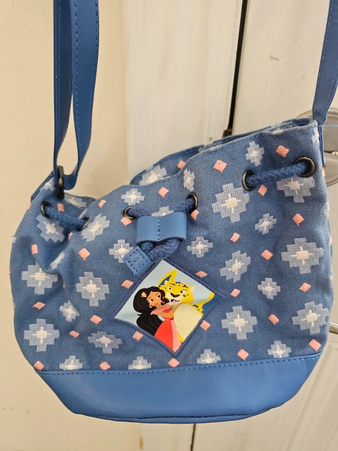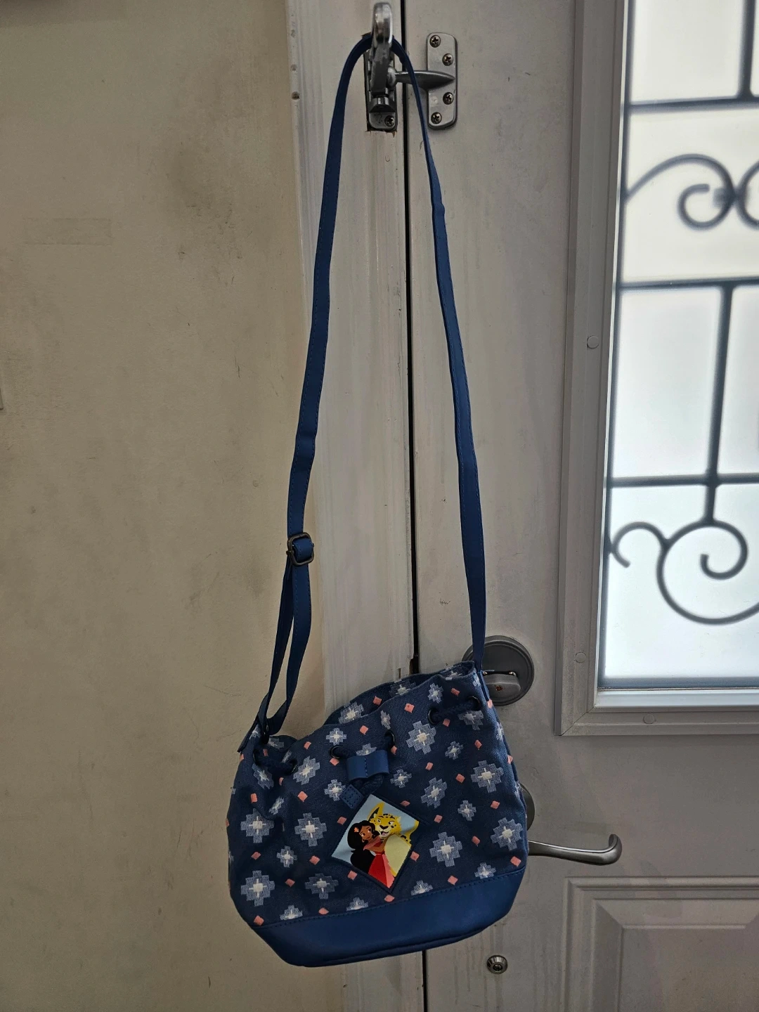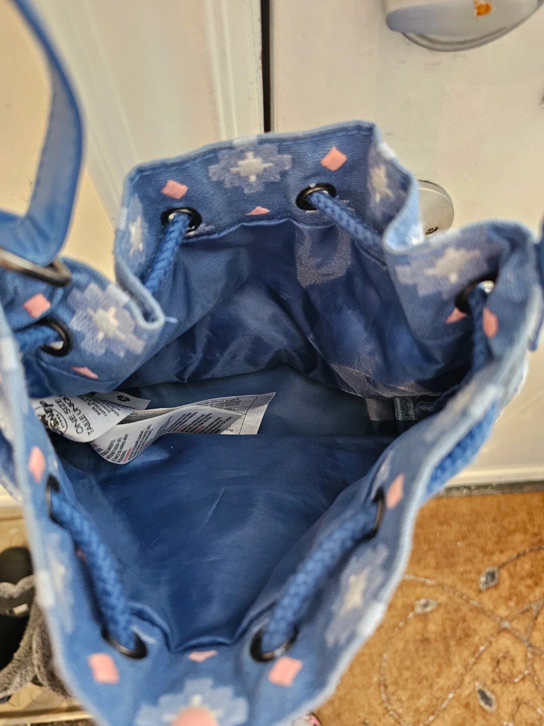 This cute blue drawstring bag features a pattern with Jasmine and Rajah. It's perfect for carrying your essentials on the go. The bag has a faux leather bottom for durability.