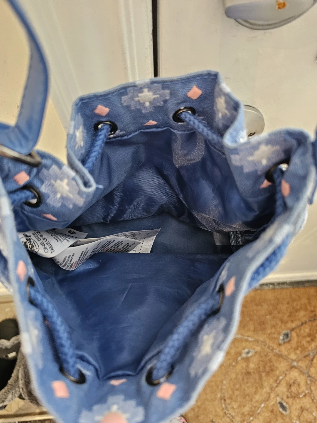 This cute blue drawstring bag features a pattern with Jasmine and Rajah. It's perfect for carrying your essentials on the go. The bag has a faux leather bottom for durability.