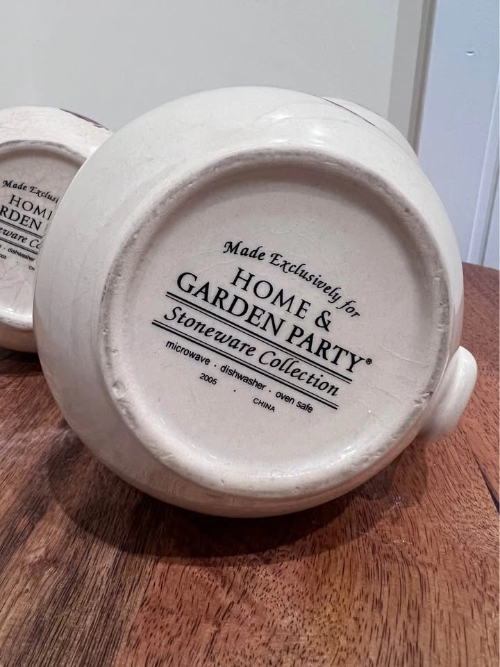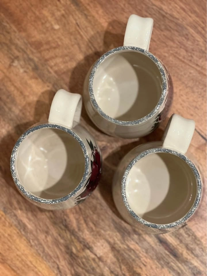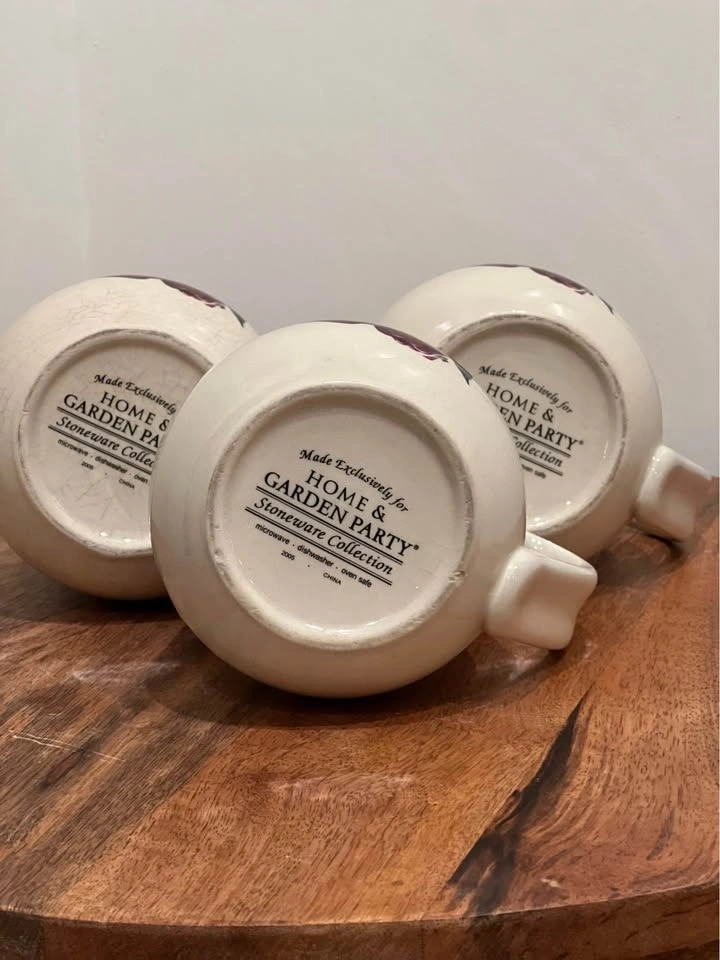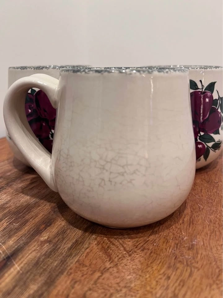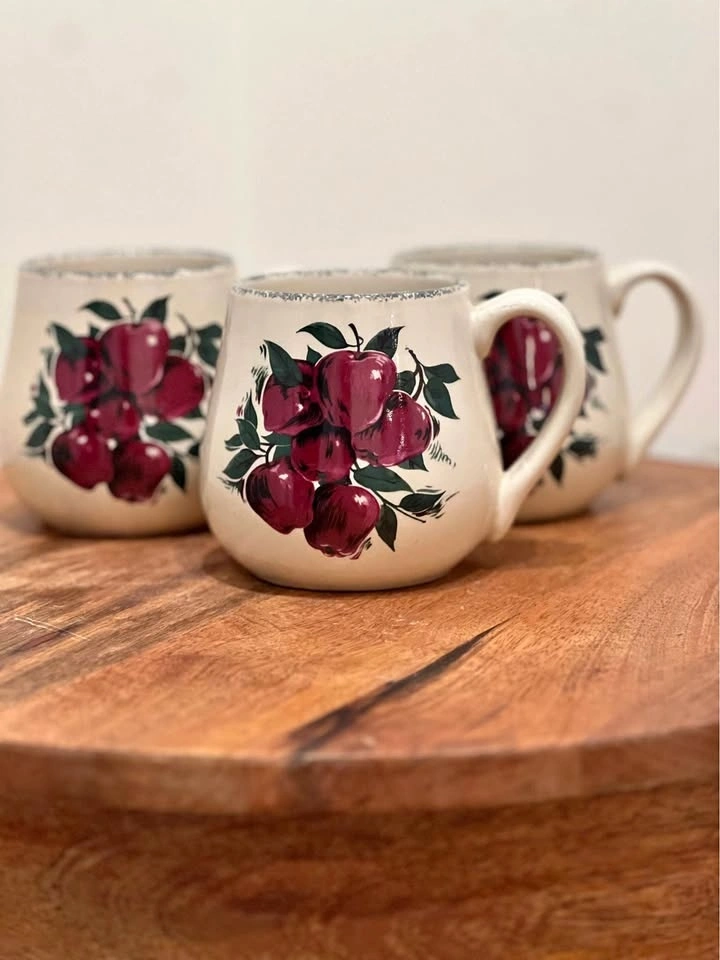 These bulbous, hand-painted mugs from Home & Garden Party feature a charming "Apple Cluster" pattern, known for their rustic appeal and collectible value. Made from durable stoneware, they are microwave, dishwasher, and oven safe. Dimensions are approximately 3 7/8 inches in height and 3 3/8 inches in width. Preowned. Pickup is at 58th and 7th Ave in midtown Manhattan.
