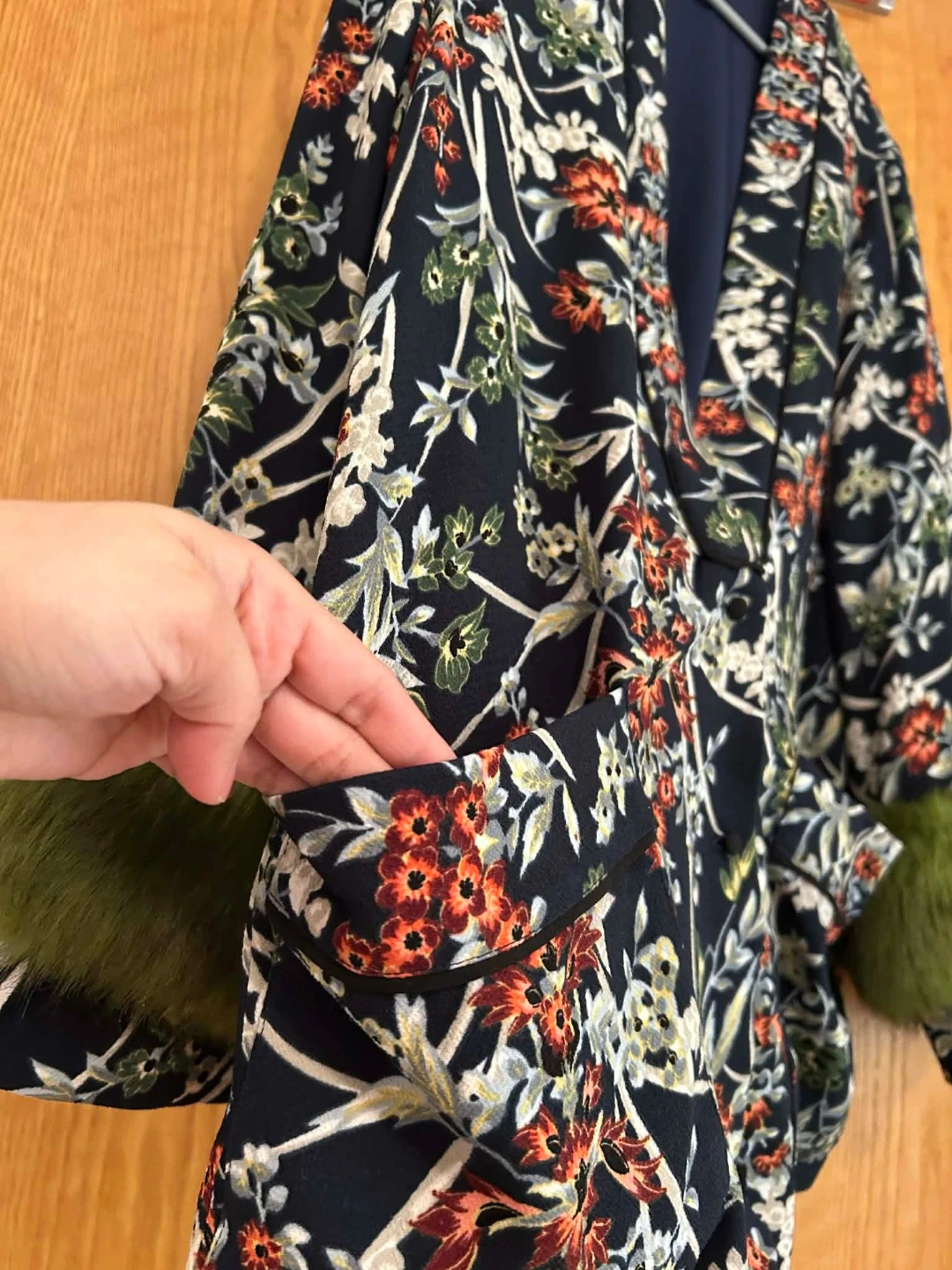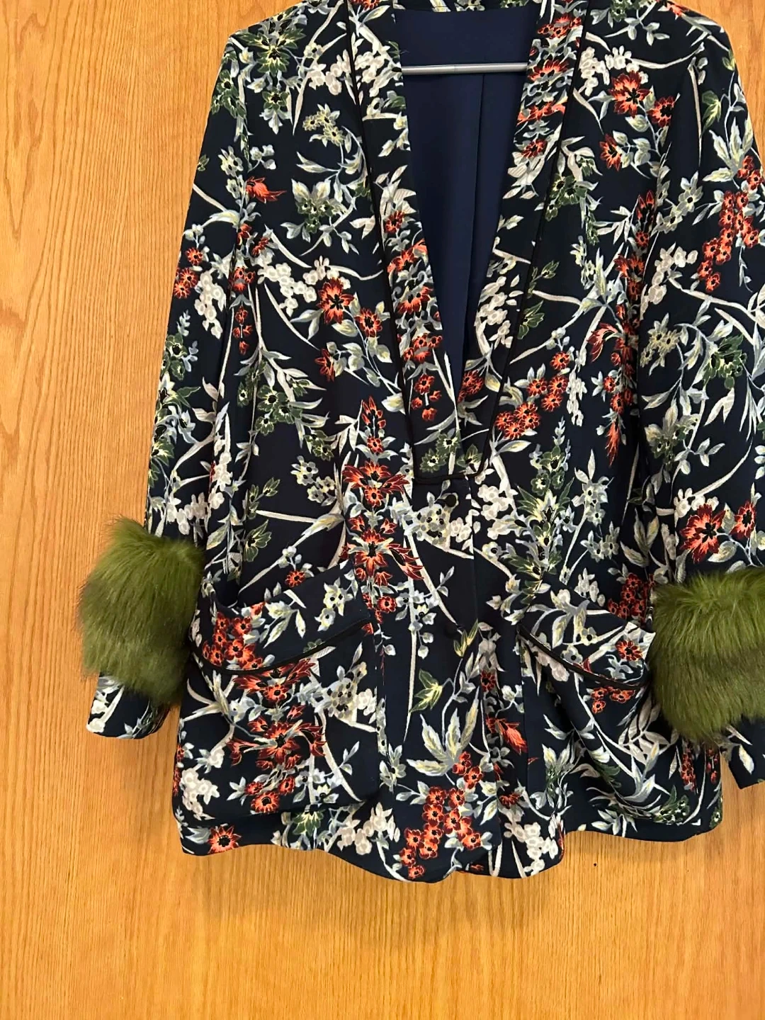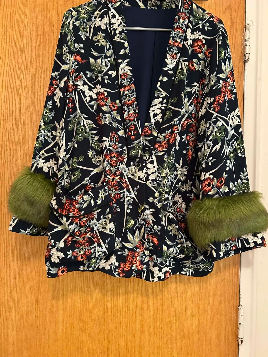 Stylish TRF Outerwear blazer with a bold floral print and green faux fur cuffs. It features a navy lining and front pockets. Size is S/M.