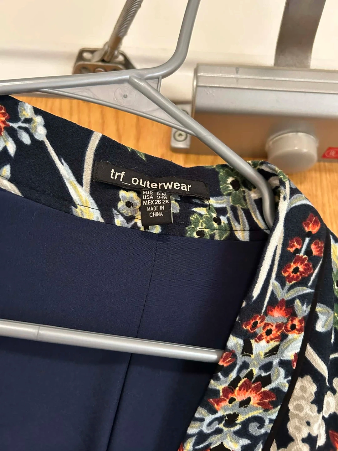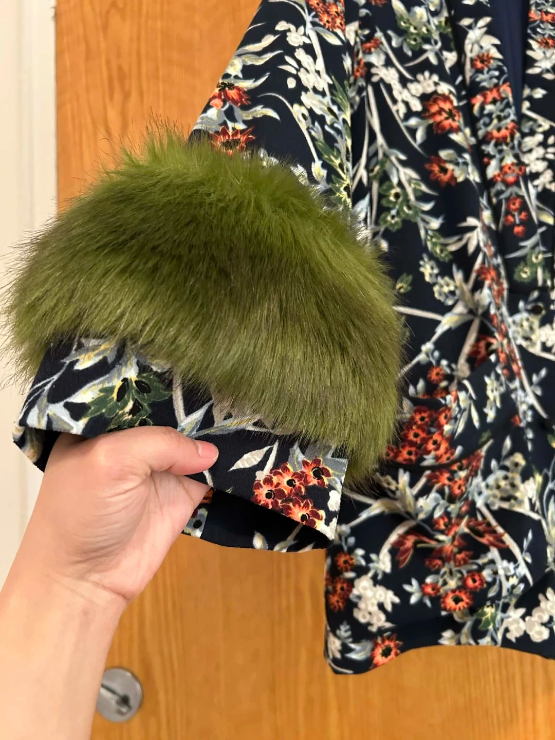 Stylish TRF Outerwear blazer with a bold floral print and green faux fur cuffs. It features a navy lining and front pockets. Size is S/M.