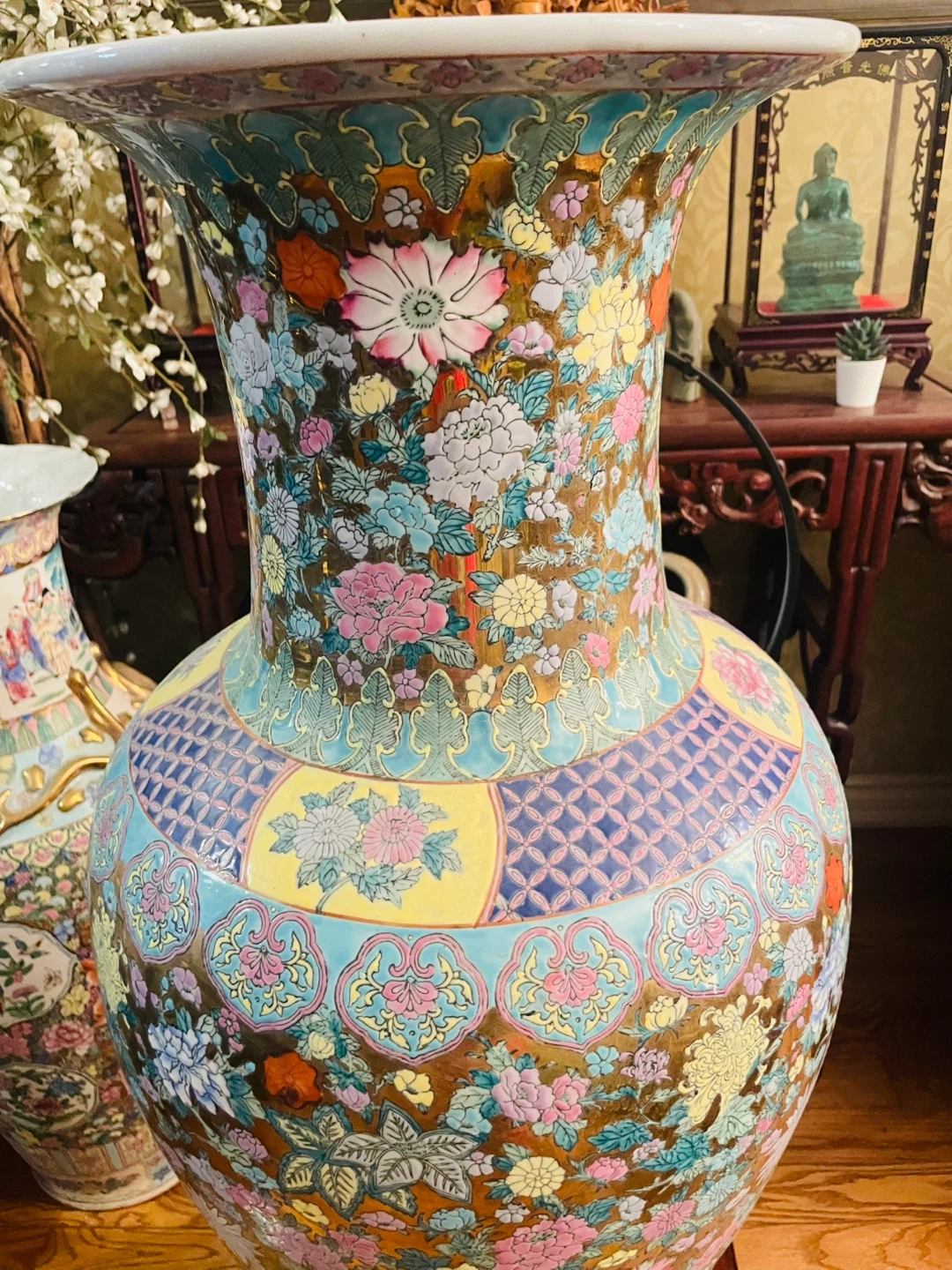 This is a stunning, large porcelain vase with a vibrant floral design. It features a wide opening and intricate patterns. Perfect for adding a touch of elegance to any room's decor. 37” H