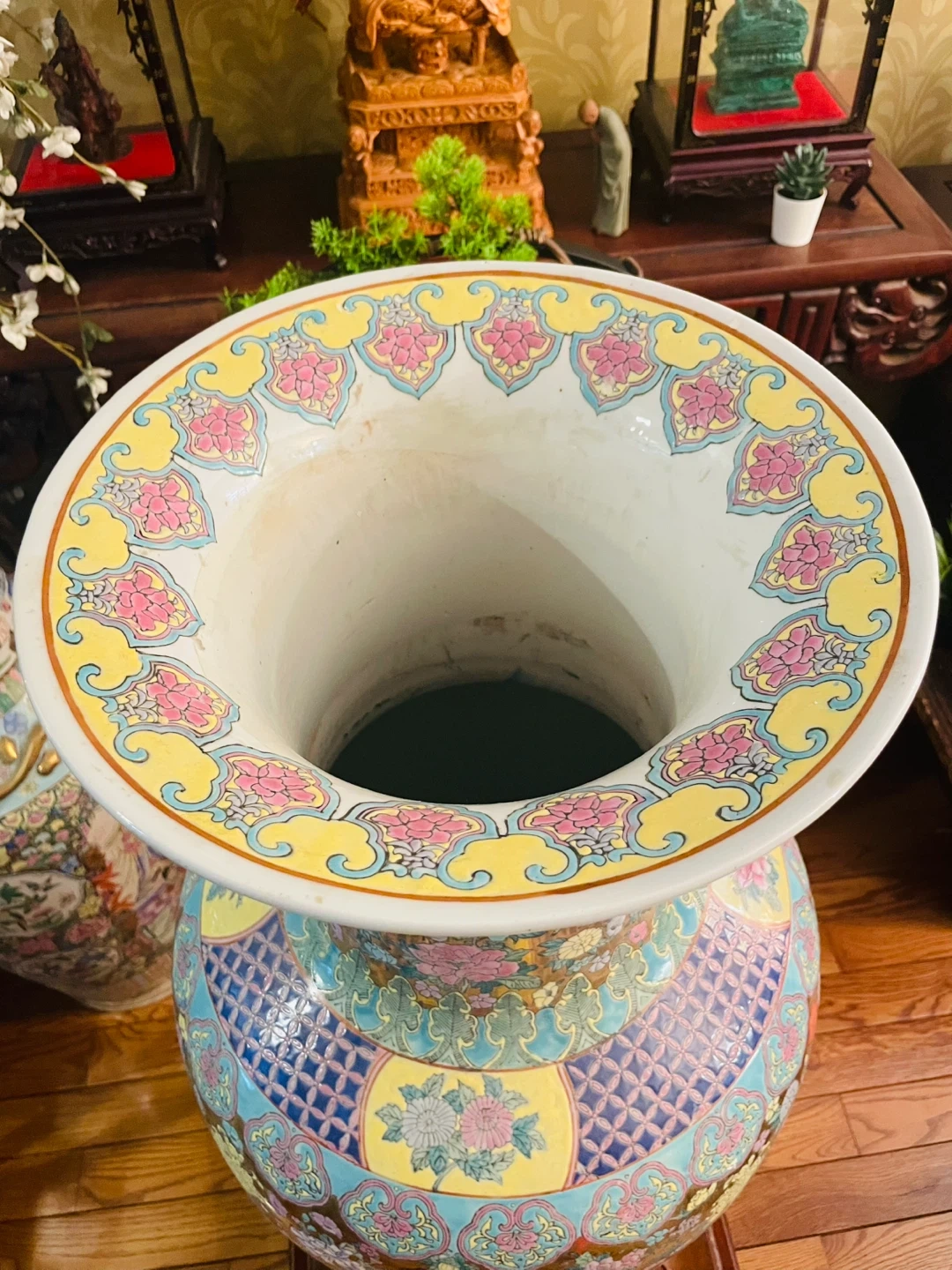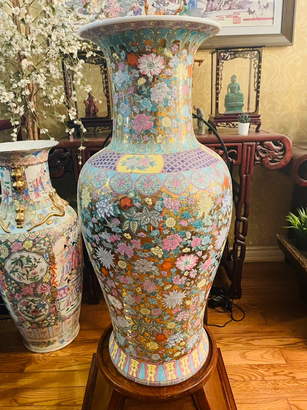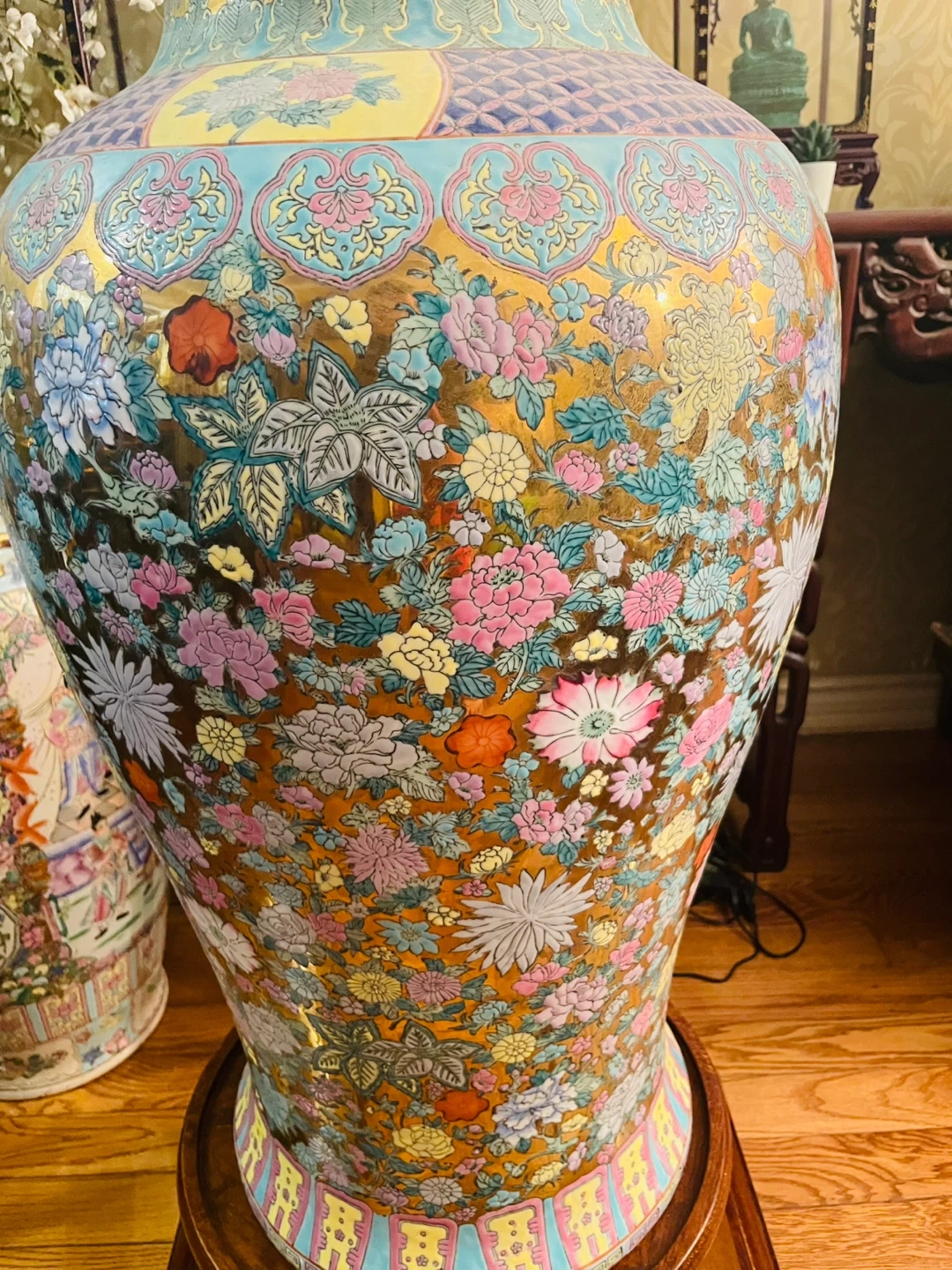 This is a stunning, large porcelain vase with a vibrant floral design. It features a wide opening and intricate patterns. Perfect for adding a touch of elegance to any room's decor. 37” H