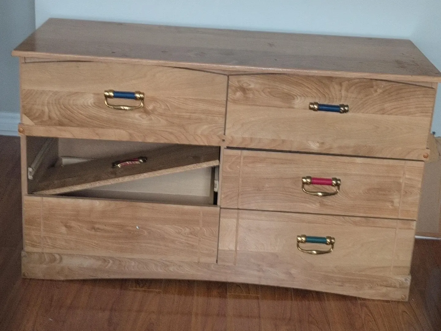 A light wood dresser with six drawers. Features decorative drawer pulls in blue, red, and green. One drawer is partially open, showing its interior. This dresser would work well for storing clothes or linens.
