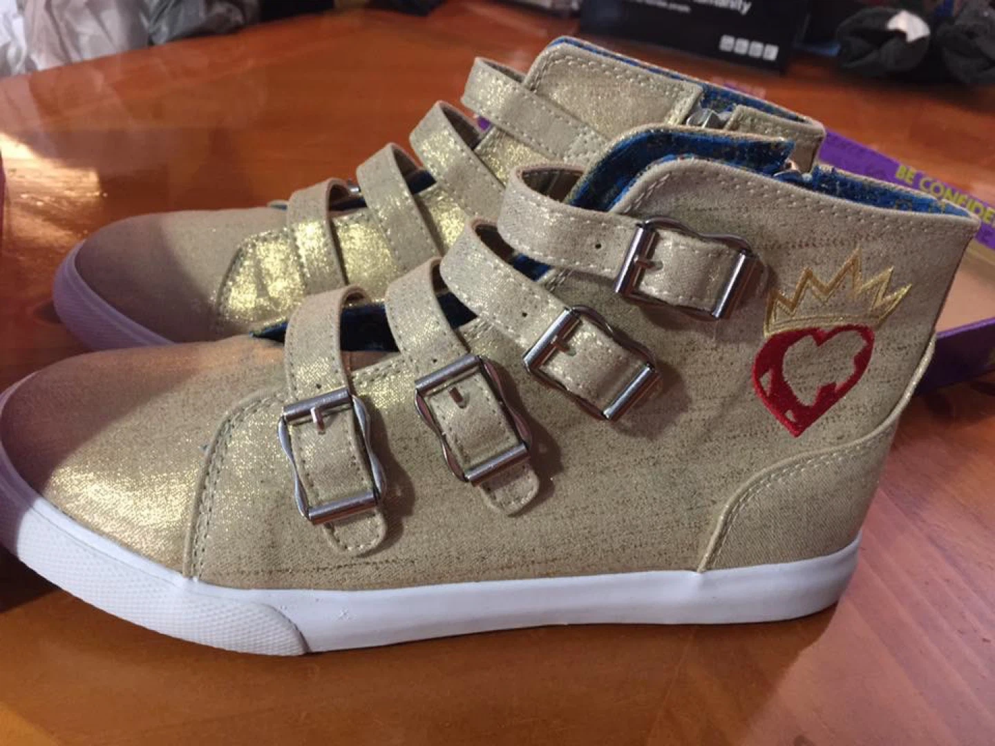 Gold glitter high-top sneakers with multiple buckle straps. Features the Disney character Evie's crown and heart emblem on the side. Includes original box. Size 5.