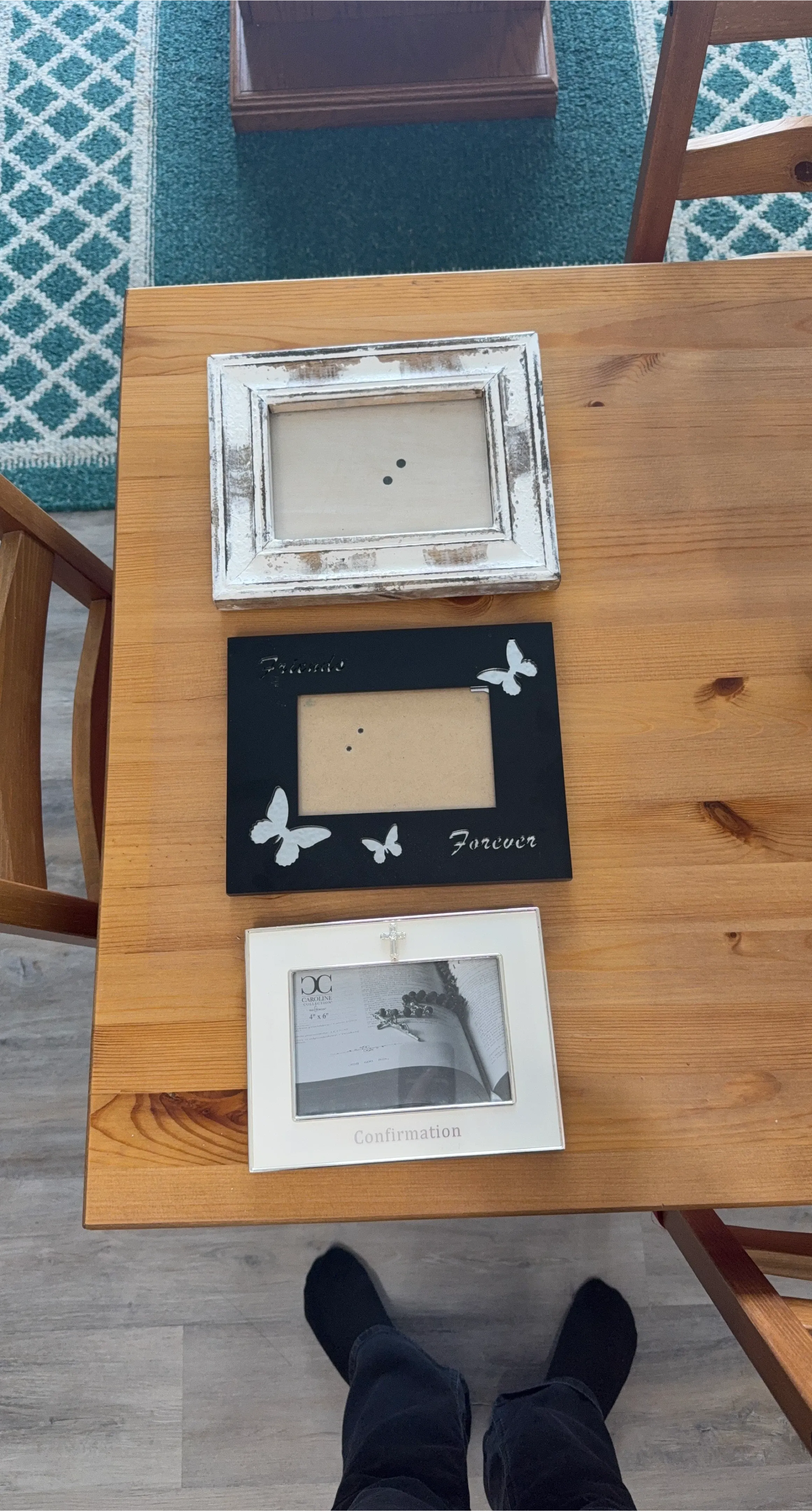 This set includes three decorative photo frames. One has a distressed white finish, another is black with a butterfly design and 'Friends Forever' text, and the third is white with a cross and 'Confirmation' text. The white confirmation frame is sized for 4"x6" photos.