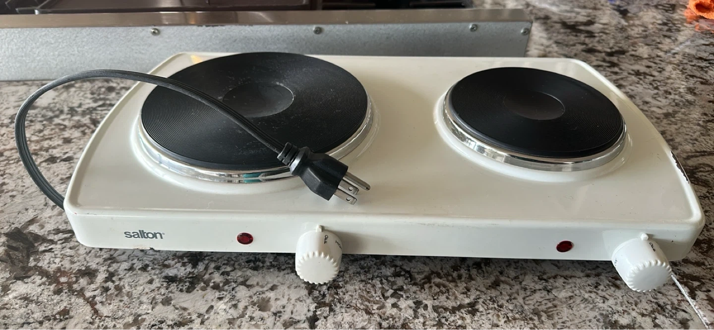 Salton white portable double burner hot plate. It has two heating elements with individual temperature controls. Great for small kitchens or dorm rooms!